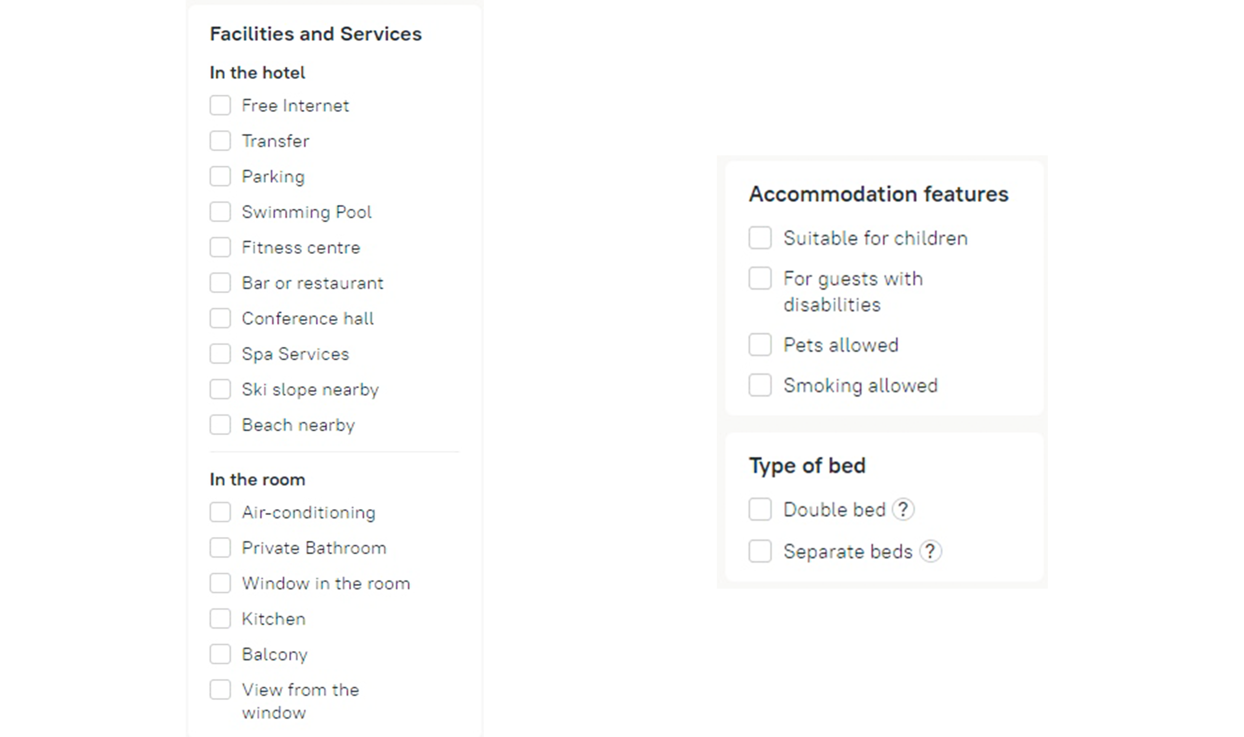 In the room facilities section you can choose whether you need a balcony or picturesque view, and you can use a separate filter to select a specific bed type.