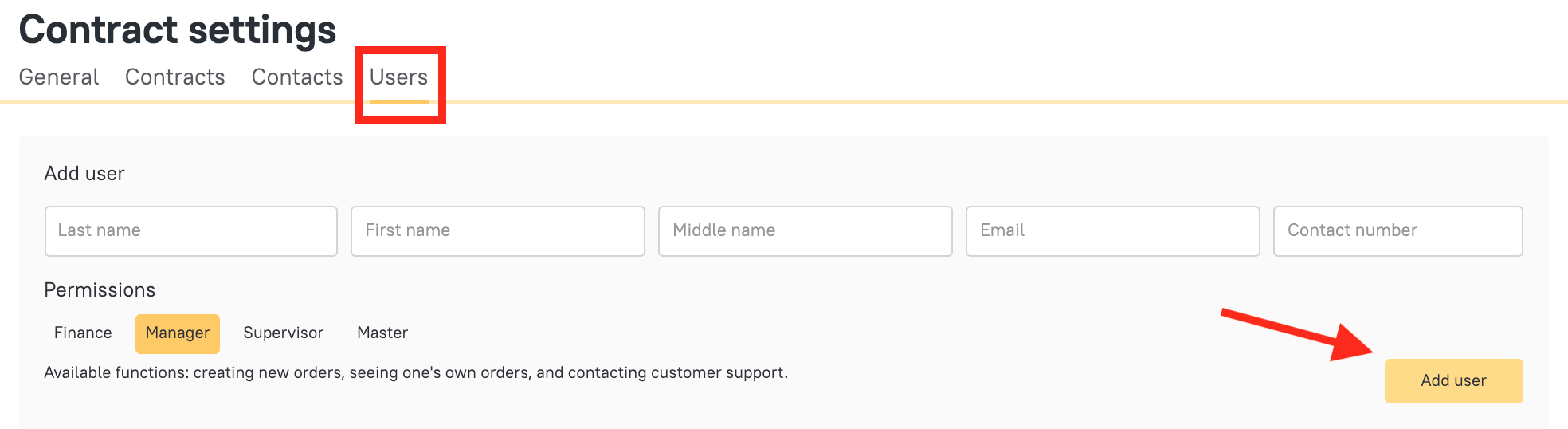 - Master: the user creates orders, sees all existing orders under the contract and all financial documents. They can also edit other users’ data and give out access.