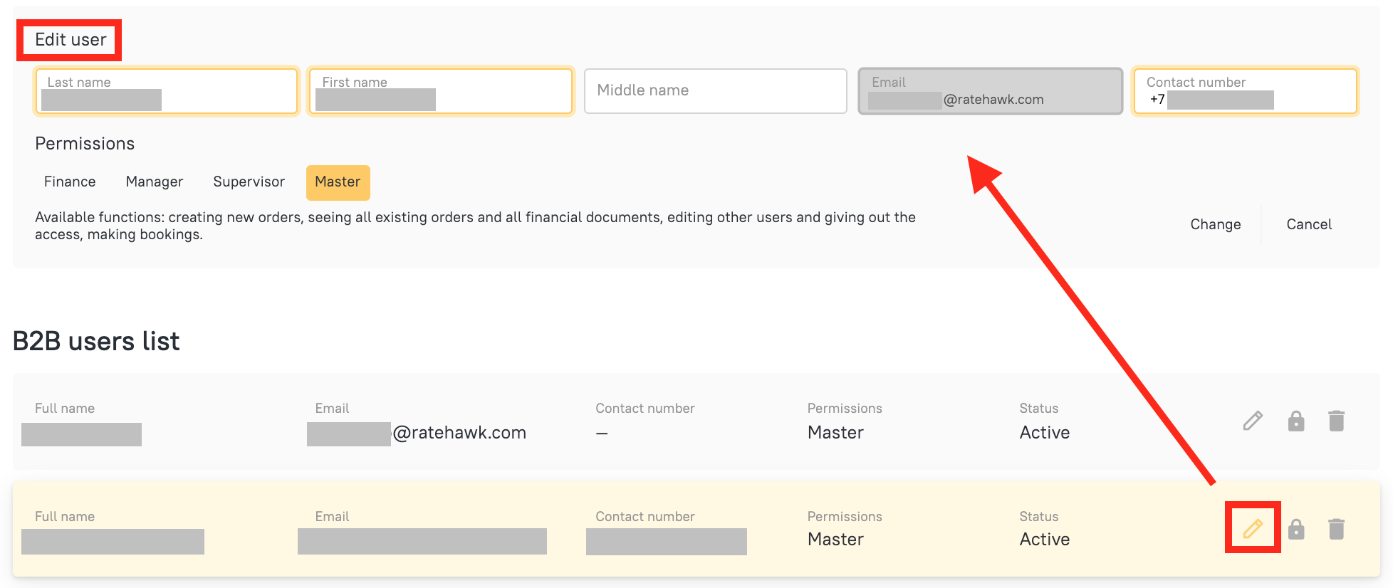 In order to edit a user’s details, click on the Pencil icon and amend the information.