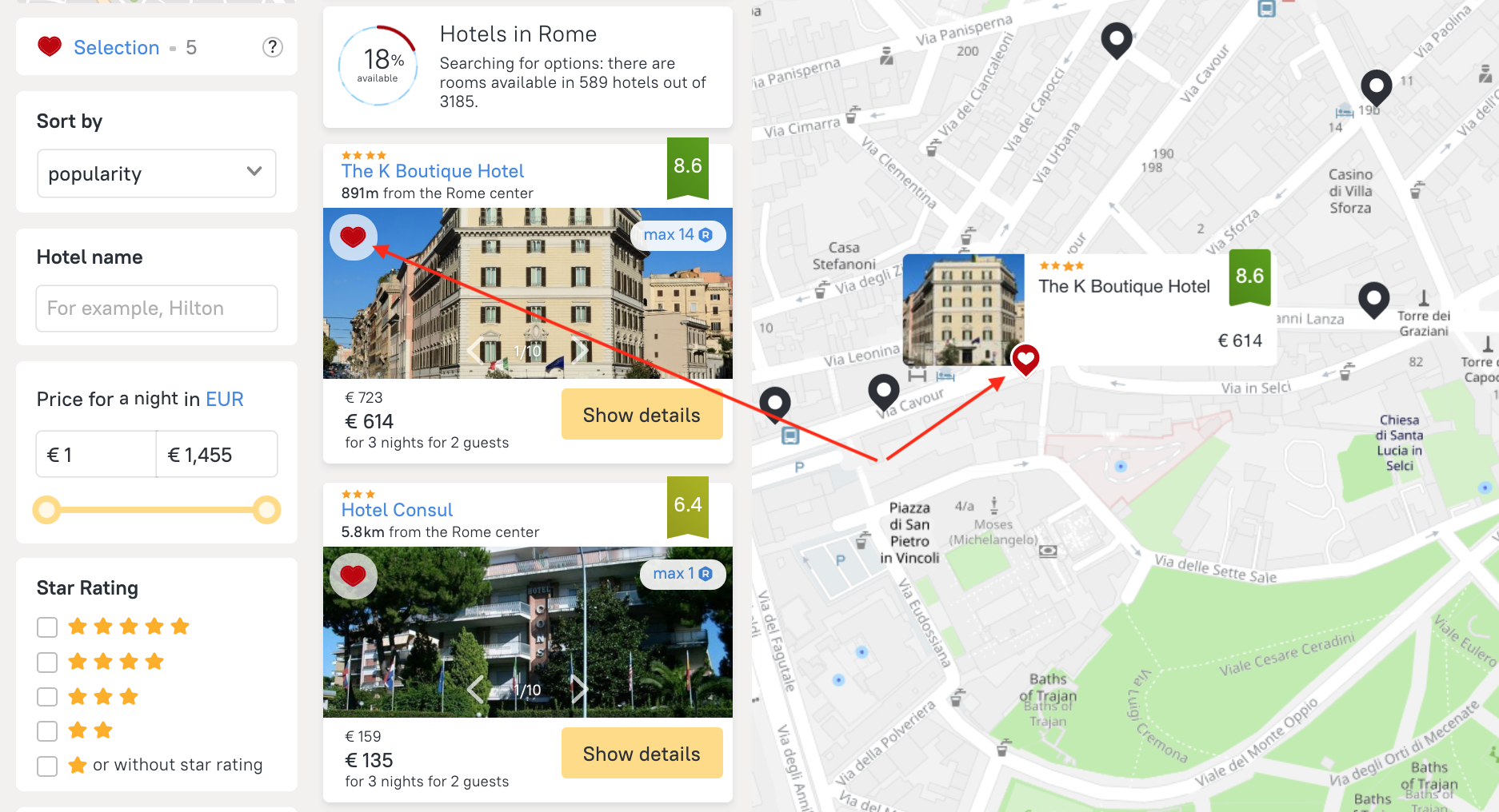 1. Select the hotel that you wish to add to the selection and click on the heart icon. The selected option will be highlighted on the map with a red pin.
