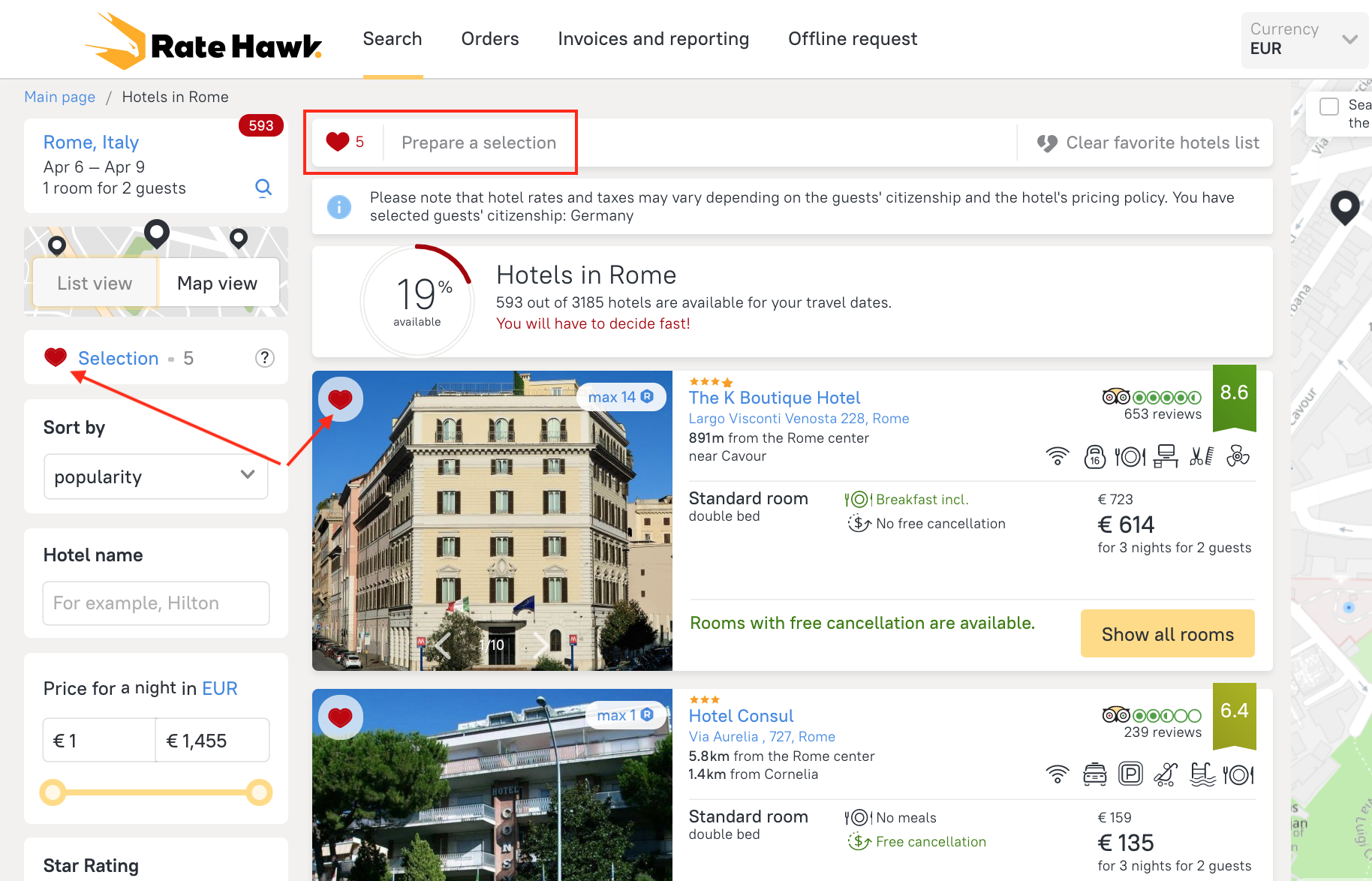 2. Once you highlight all the required hotels, click on “Prepare а selection” in the top part of the screen.