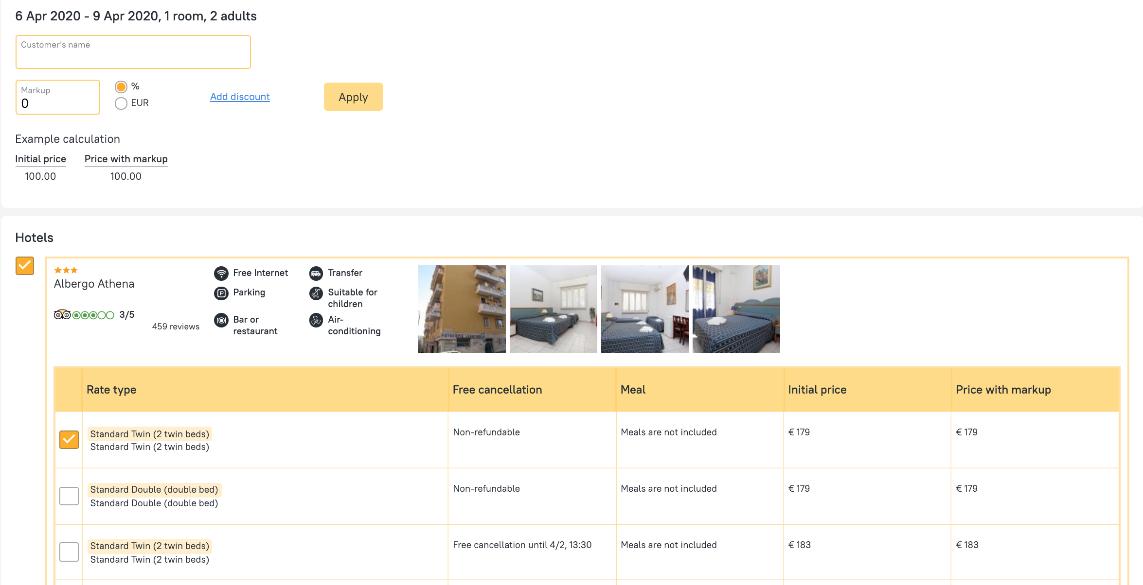 3. Draw up the proposal, filling in the relevant fields: show the customer name, markup that you require (percentage or fixed), discount (if needed), appropriate room categories, and rate types.