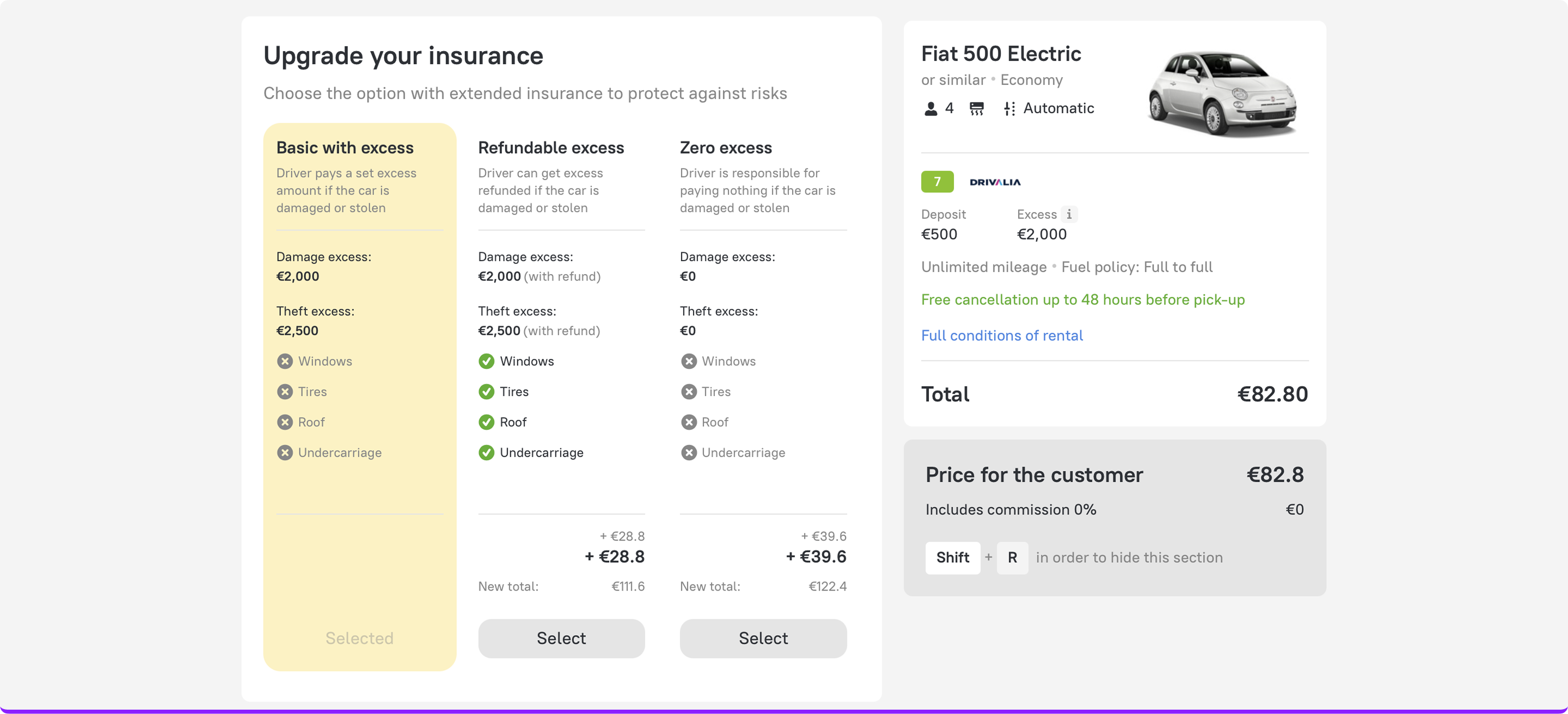 When you select a basic excess insurance plan, you will now see one or more upgraded options, depending on availability. We make it easy to compare the cost and coverage differences side by side so you can book faster and smarter.