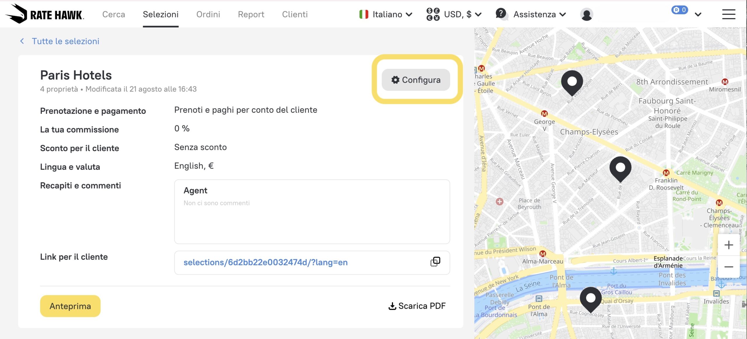 Il nostro strumento Selezioni consente agli agenti di viaggio di predisporre un elenco personalizzato delle offerte migliori scegliendole in base alle esigenze dei clienti. Le selezioni non si limitano alle strutture ricettive, ma riguardano anche i voli, i transfer o altri servizi aggiuntivi, in modo da vendere più velocemente con un unico messaggio. Tramite un link speciale puoi inviare una selezione a un cliente, il quale può scegliere direttamente dall’elenco la soluzione che ritiene più adatta. Grazie a questo recente aggiornamento, lo strumento Selezioni ha fatto un salto di qualità.
