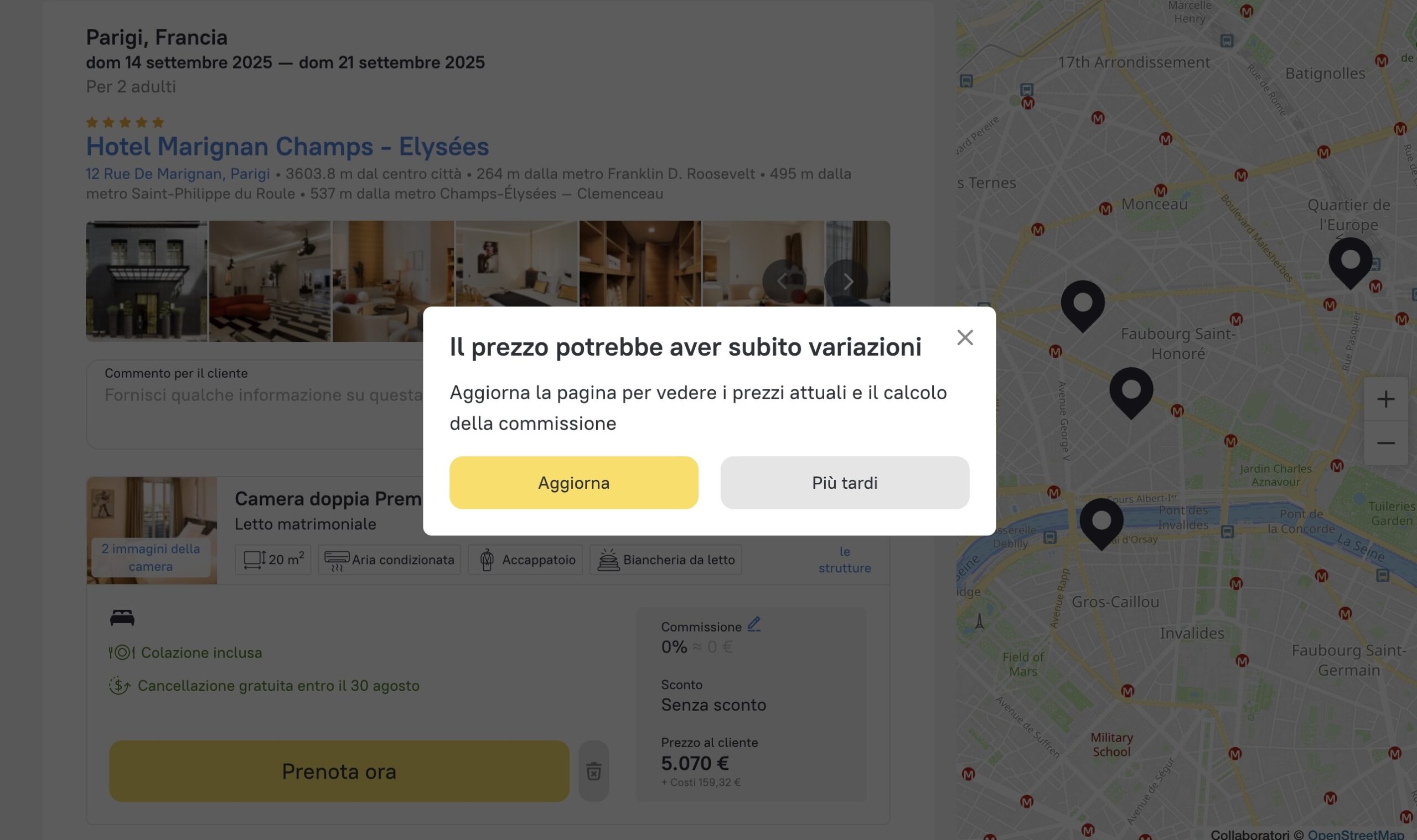 Ora la selezione si apre in una nuova finestra, dove le tariffe e le disponibilità più aggiornate appaiono automaticamente. Se rimani sulla pagina per più di 10 minuti, compare una notifica pop-up che ti chiede di aggiornarla per visualizzare la tariffe più recenti. Questo vale sia per gli agenti che per i clienti e garantisce che tutti visualizzino le offerte più aggiornate.