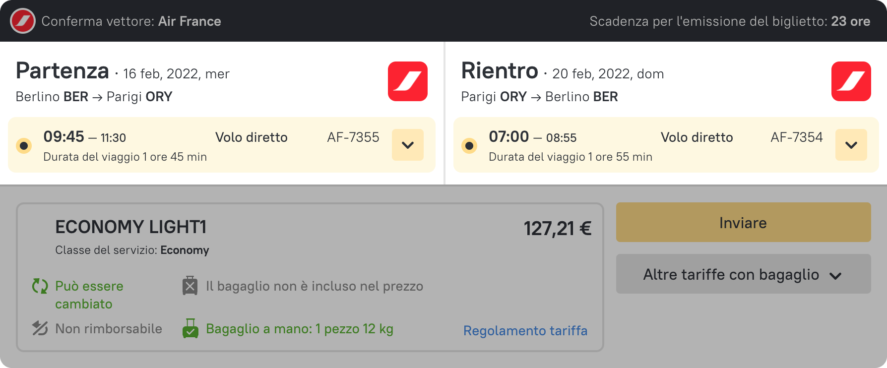 - per ogni opzione viene evidenziato il numero del volo.
