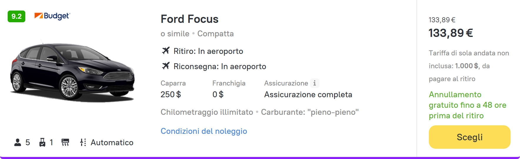 - Condizioni assicurative immediatamente visibili: per controllare il tipo di assicurazione e la descrizione dettagliata della polizza direttamente sulla scheda dell’auto a noleggio.