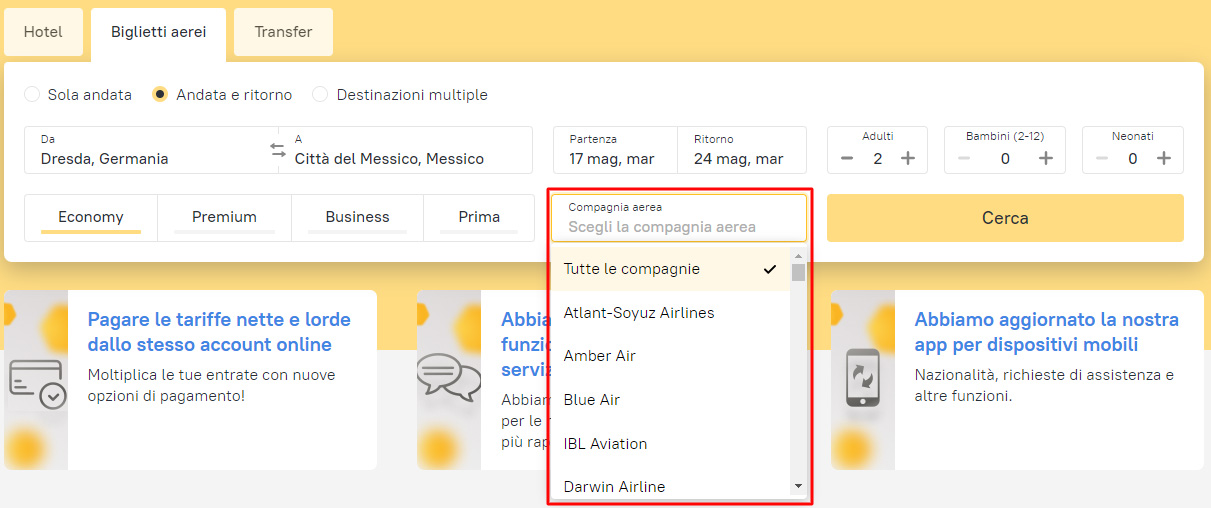 Con questa nuova funzione, potrai filtrare la ricerca per compagnia aerea già al momento in cui imposterai la destinazione e la data del volo di andata. In questo modo la ricerca includerà tutte le offerte della linea aerea selezionata. Questo è importante soprattutto per le destinazioni più popolari, dove solitamente trovi molte offerte di più compagnie aeree e spesso non tutte le opzioni appaiono nei risultati della ricerca.