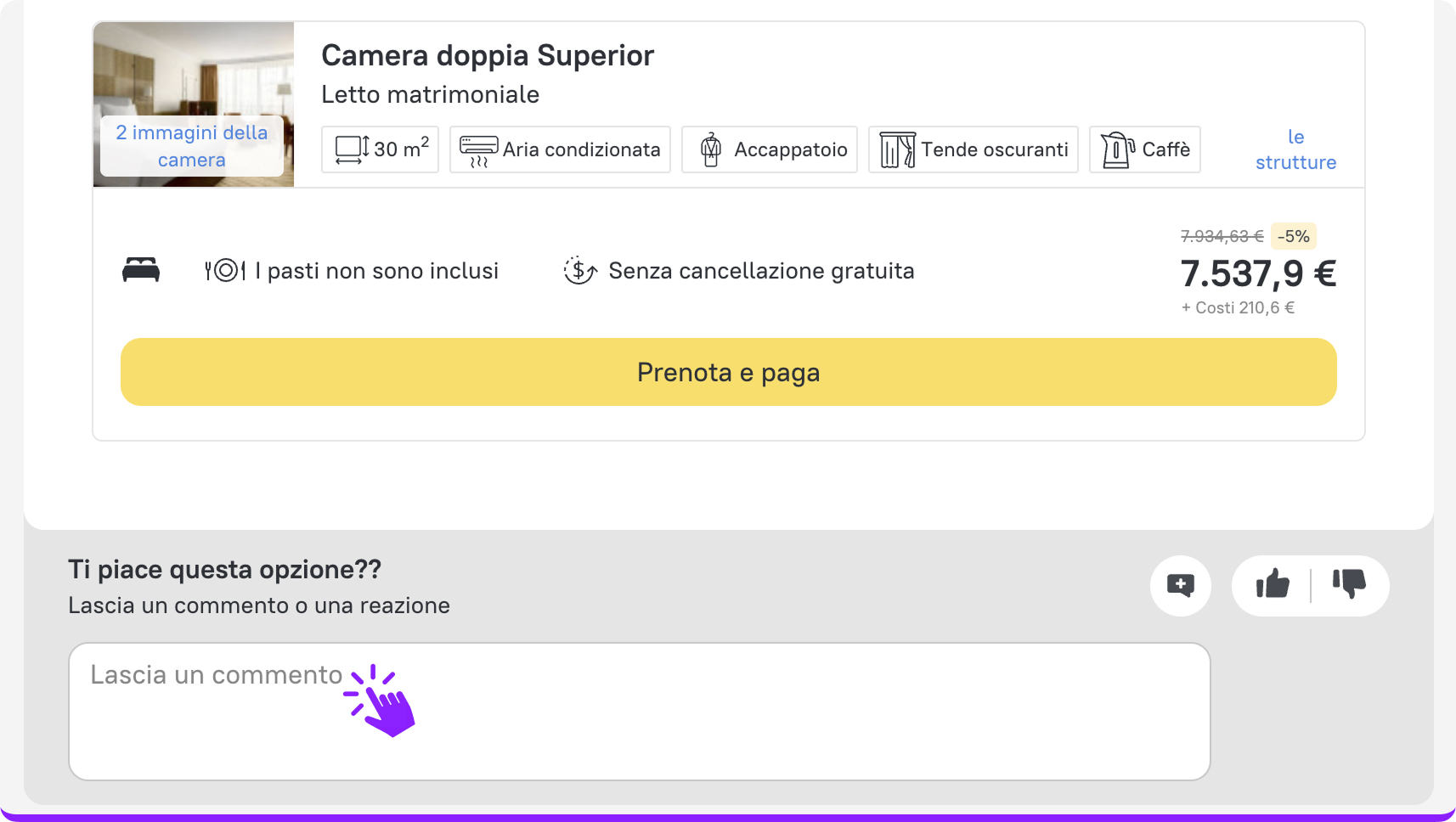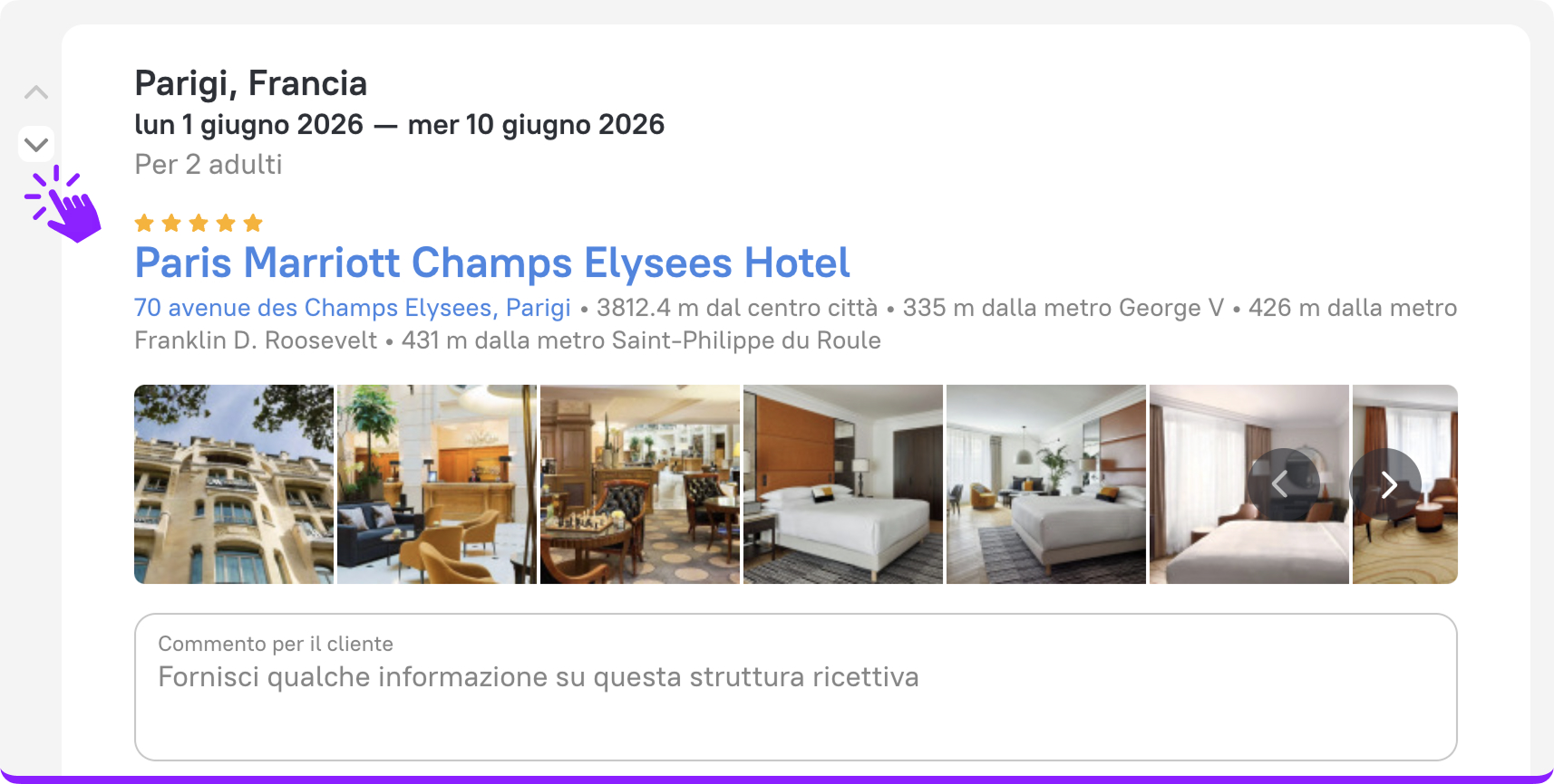 Niente più supposizioni: ora i tuoi clienti possono reagire e commentare direttamente all’interno della Selezione. In questo modo puoi capire meglio le loro preferenze, perfezionare le proposte più rapidamente e trasformarle in prenotazioni confermate con maggiore efficienza.