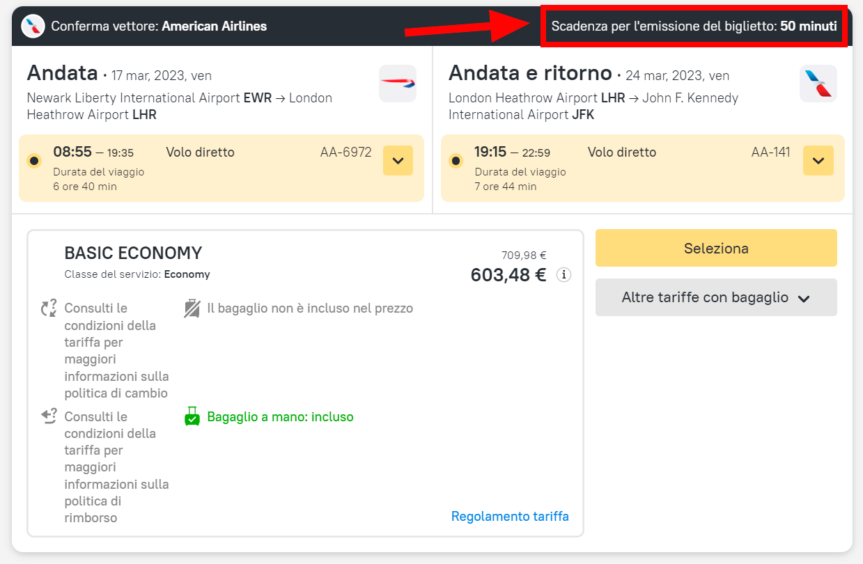 Una prenotazione si considera annullata se il biglietto non è stato emesso. Per evitare situazioni del genere, devi rispettare il limite di tempo (il periodo entro il quale il biglietto può essere emesso). Tale limite è visualizzato nell’angolo in alto a destra del riquadro delle opzioni dell’itinerario.