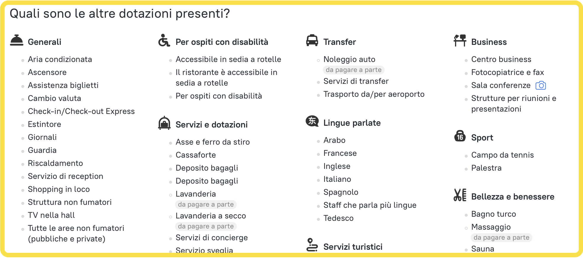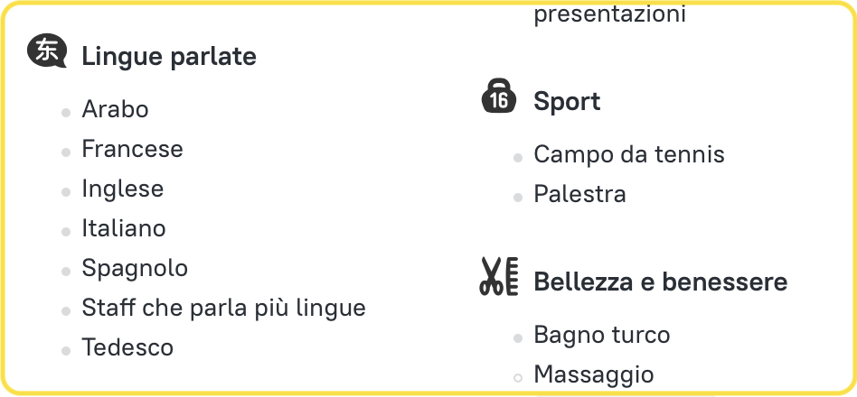 I clienti hanno anche richiesto di usufruire di servizi spa in hotel. Scorrendo verso il basso fino a “I servizi e le strutture”, puoi selezionare il servizio spa. Ora ti saranno fornite soltanto le opzioni che corrispondono alle richieste dei clienti.