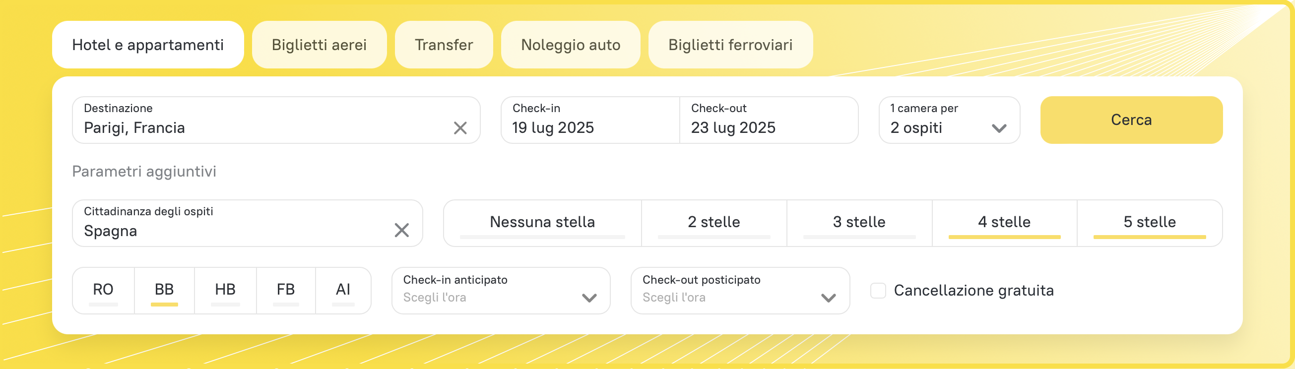 Per iniziare la tua prenotazione, vai alla pagina principale per impostare i parametri di ricerca. Inserisci la destinazione, il tipo di hotel, le date e la nazionalità dei clienti nel campo “Nazionalità degli ospiti” Cliccando su “Trova hotel”, compariranno una mappa e un elenco di hotel corrispondenti ai requisiti inseriti. La mappa interattiva ti consente di individuare velocemente gli hotel che si trovano nei pressi delle attrazioni o degli snodi di trasporto vicino ai quali i clienti si vogliono trovare. Per personalizzare ulteriormente i risultati della ricerca, sfrutta i 19 filtri disponibili, da “Pasti” a “Comfort compresi nella camera”.