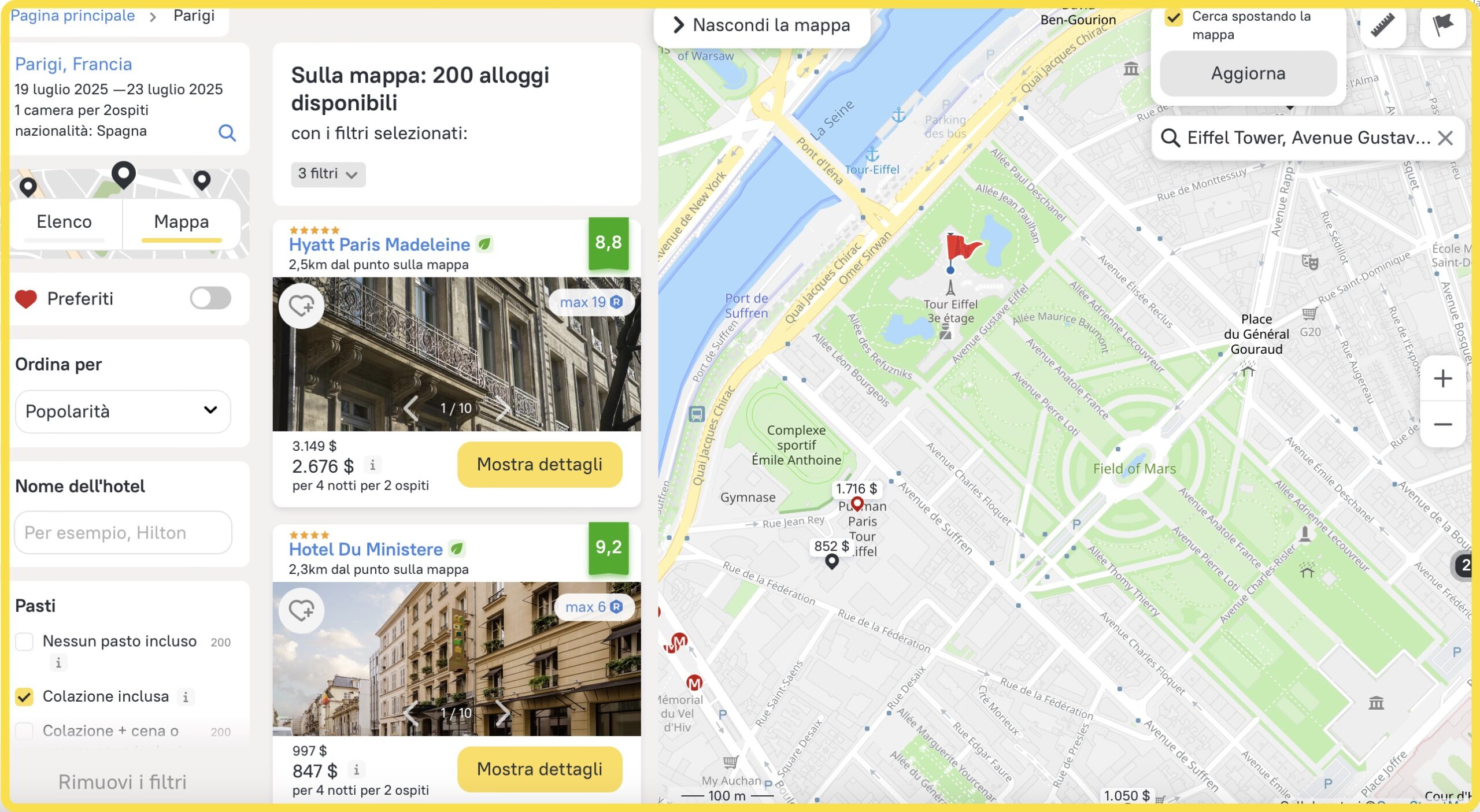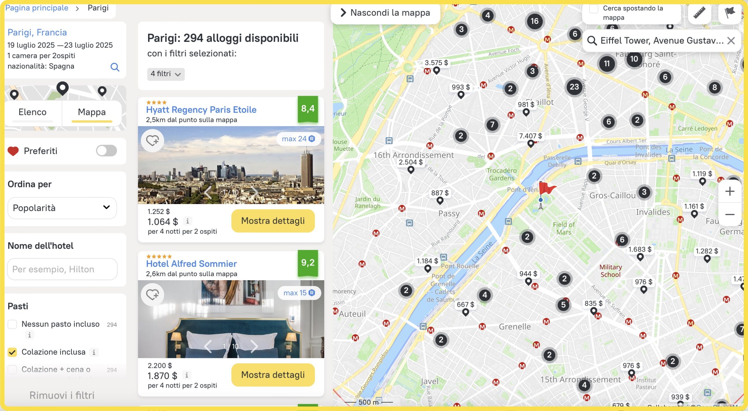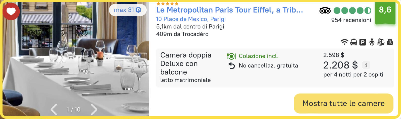 Sappiamo che i nostri clienti cercano una sistemazione nel centro della città, vicino alla Torre Eiffel e in un hotel a 4 o 5 stelle. Dato che abbiamo già incluso la categoria e la colazione nei parametri di ricerca iniziali, i risultati mostrano automaticamente gli hotel corrispondenti.