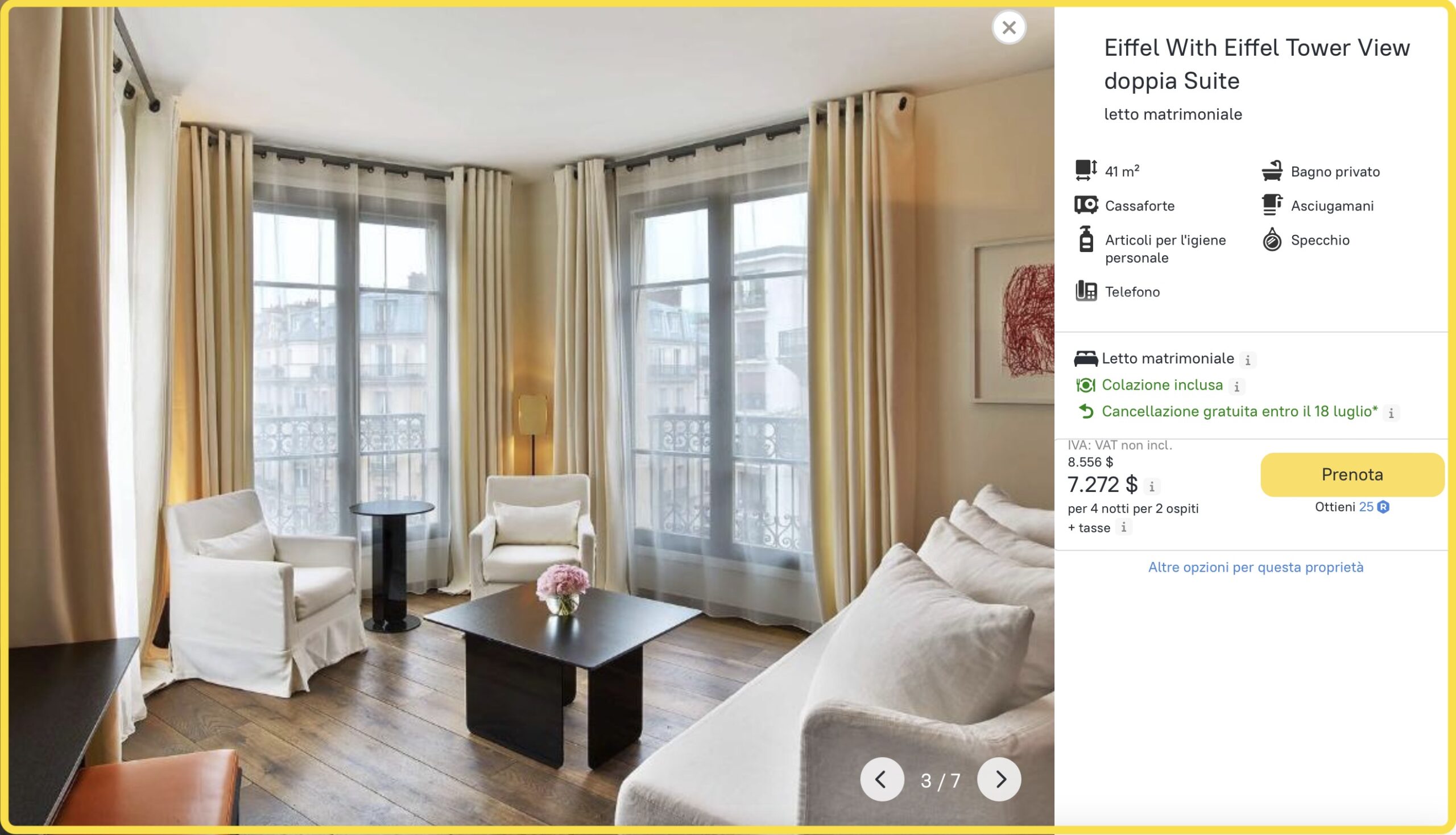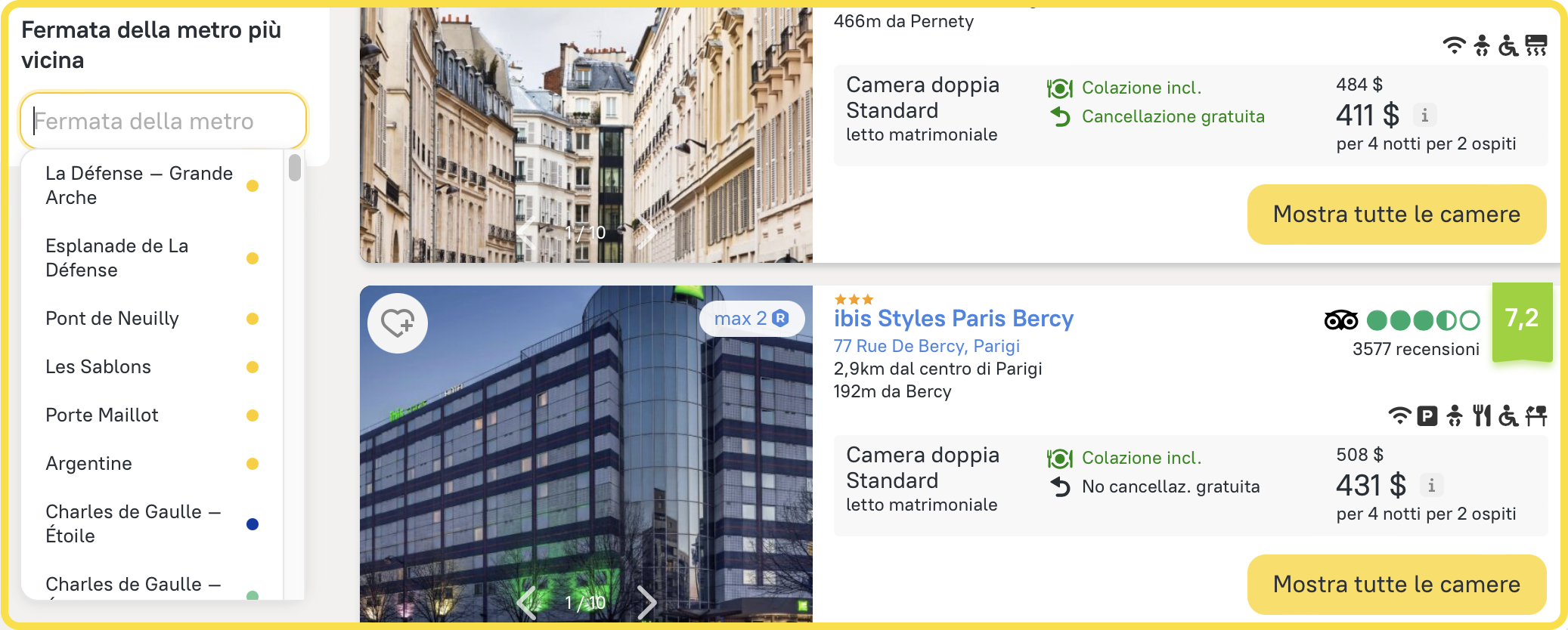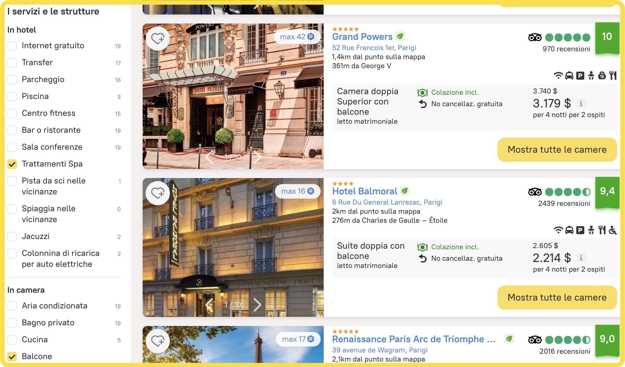 Sappiamo che i nostri clienti cercano una sistemazione nel centro della città, vicino alla Torre Eiffel e in un hotel a 4 o 5 stelle. Dato che abbiamo già incluso la categoria e la colazione nei parametri di ricerca iniziali, i risultati mostrano automaticamente gli hotel corrispondenti.