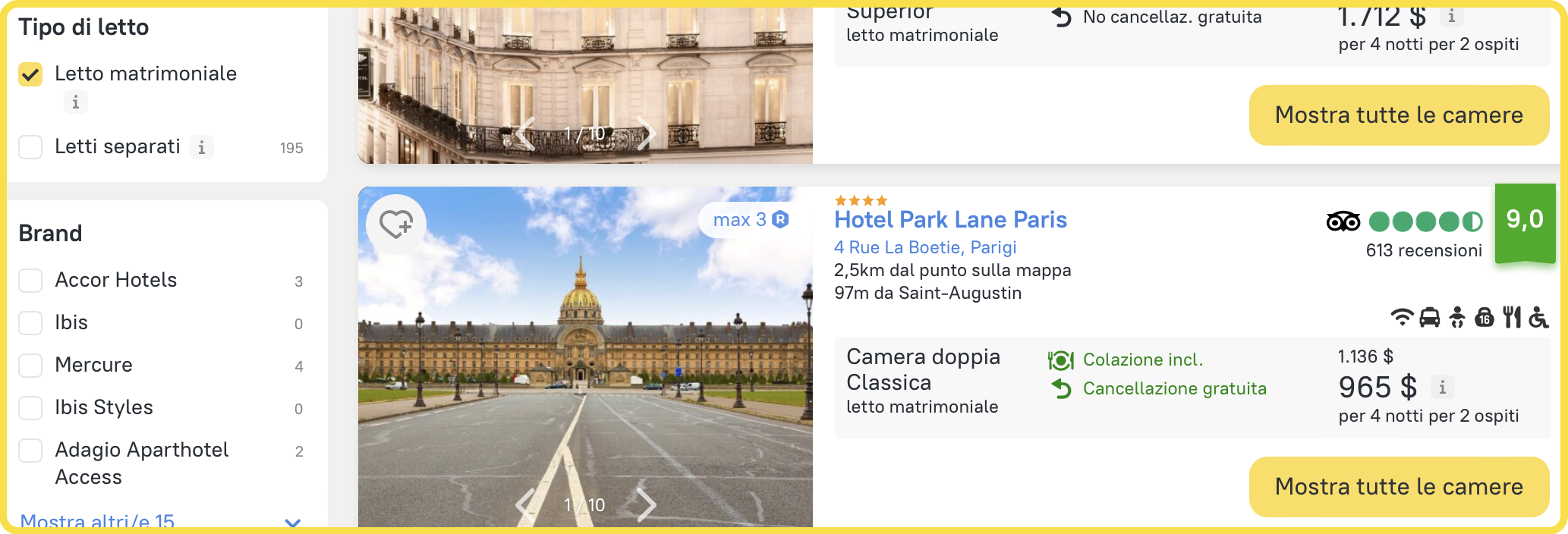 5. Usa i filtri per scegliere i comfort compresi nella camera: letto matrimoniale
