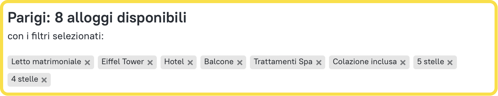 Fatto ciò, ciascuno dei filtri che hai selezionato segmenterà l’elenco degli hotel disponibili. In questo modo, la ricerca viene ristretta solamente a ciò che è stato richiesto di visualizzare.