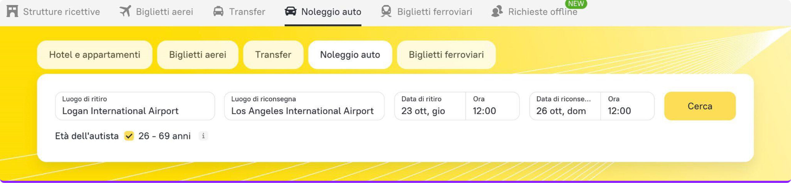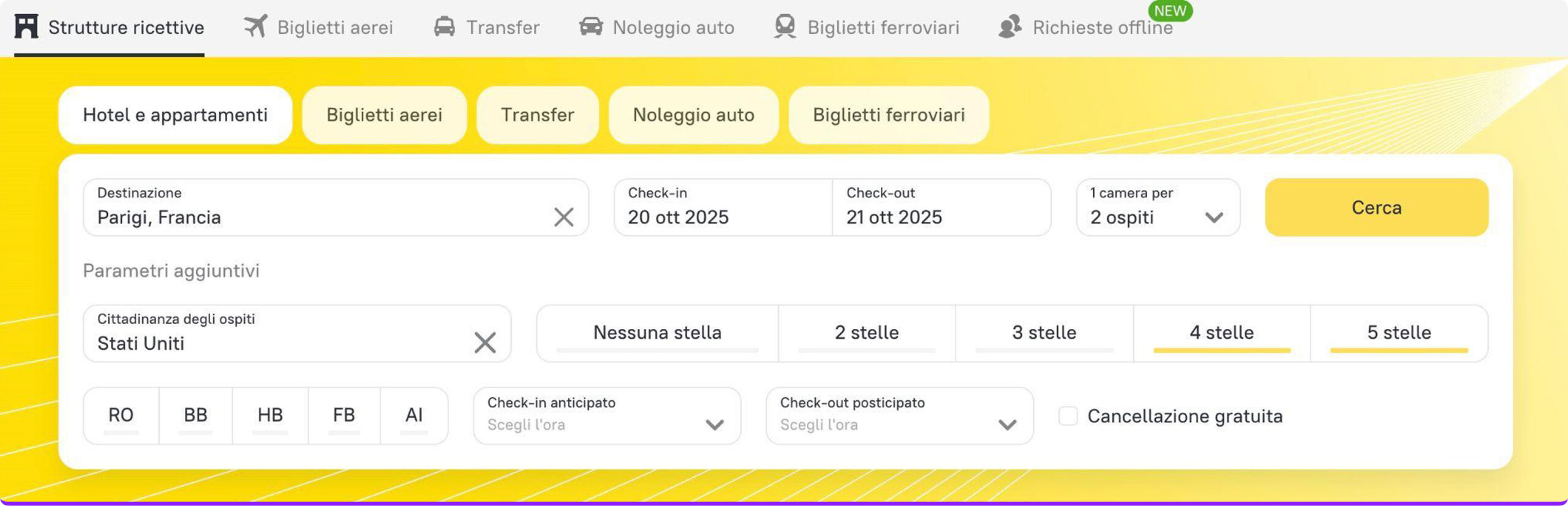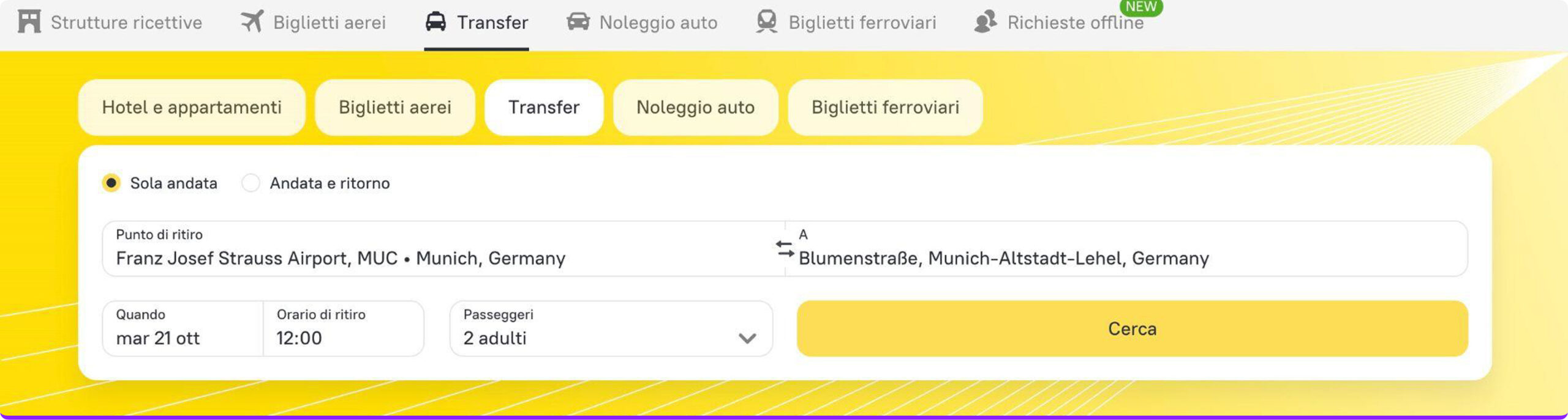 Grazie a RateHawk puoi offrire ai clienti soluzioni complete che combinano più servizi turistici in un’unica proposta, a partire da hotel e transfer fino a voli, treni e auto a noleggio. Questo non solo aggiunge valore al viaggio del cliente, ma crea anche l’opportunità di aumentare le vendite per ciascuna vacanza.
