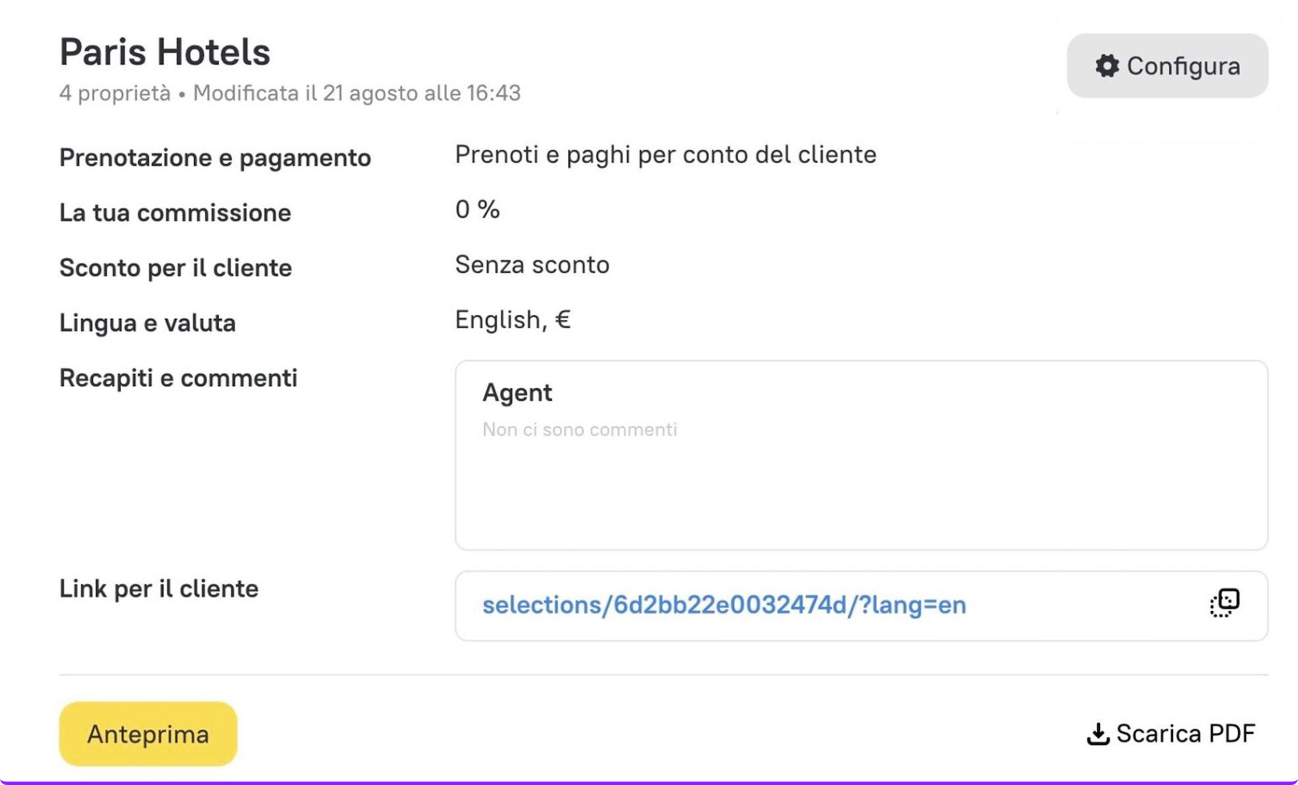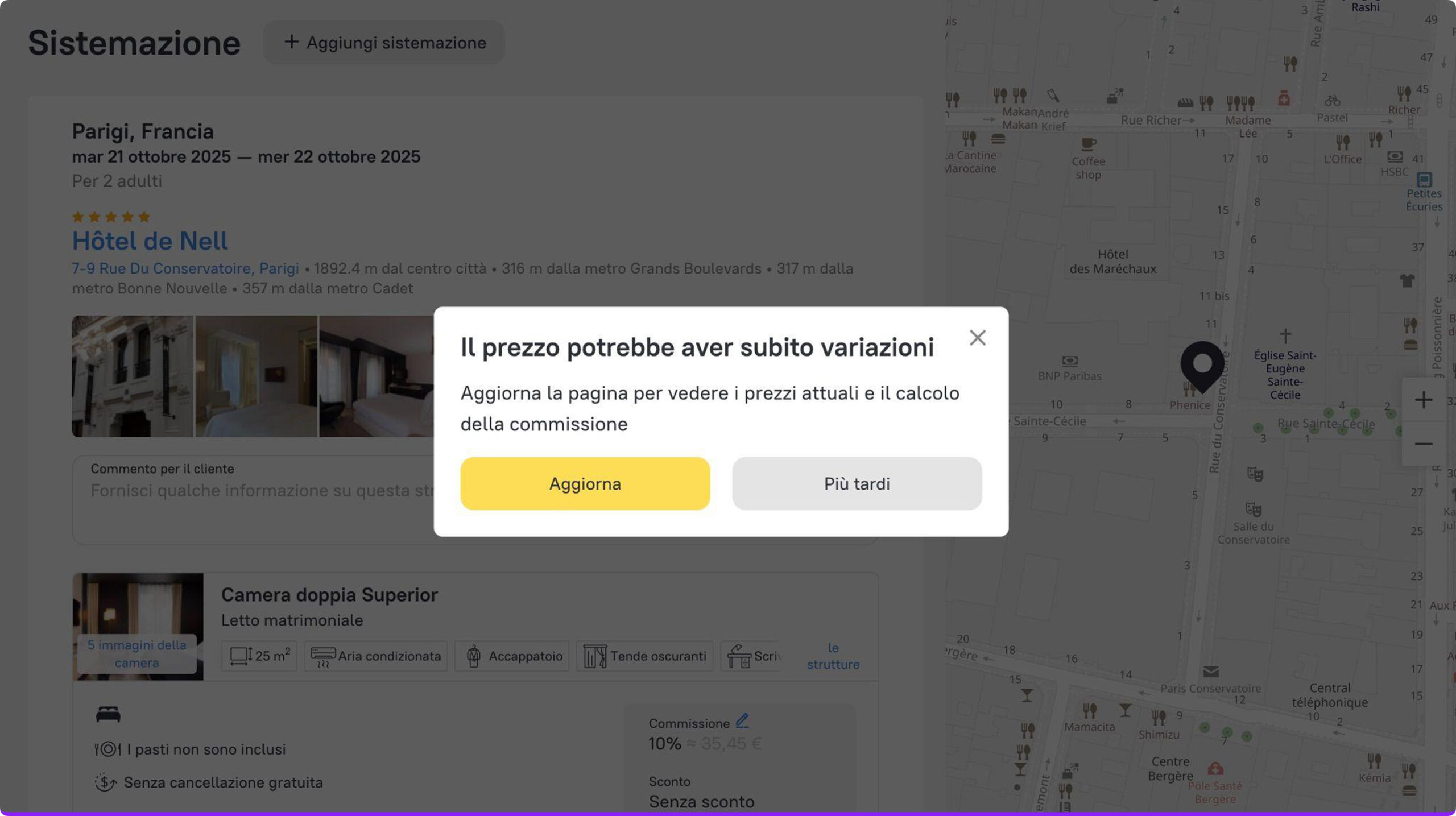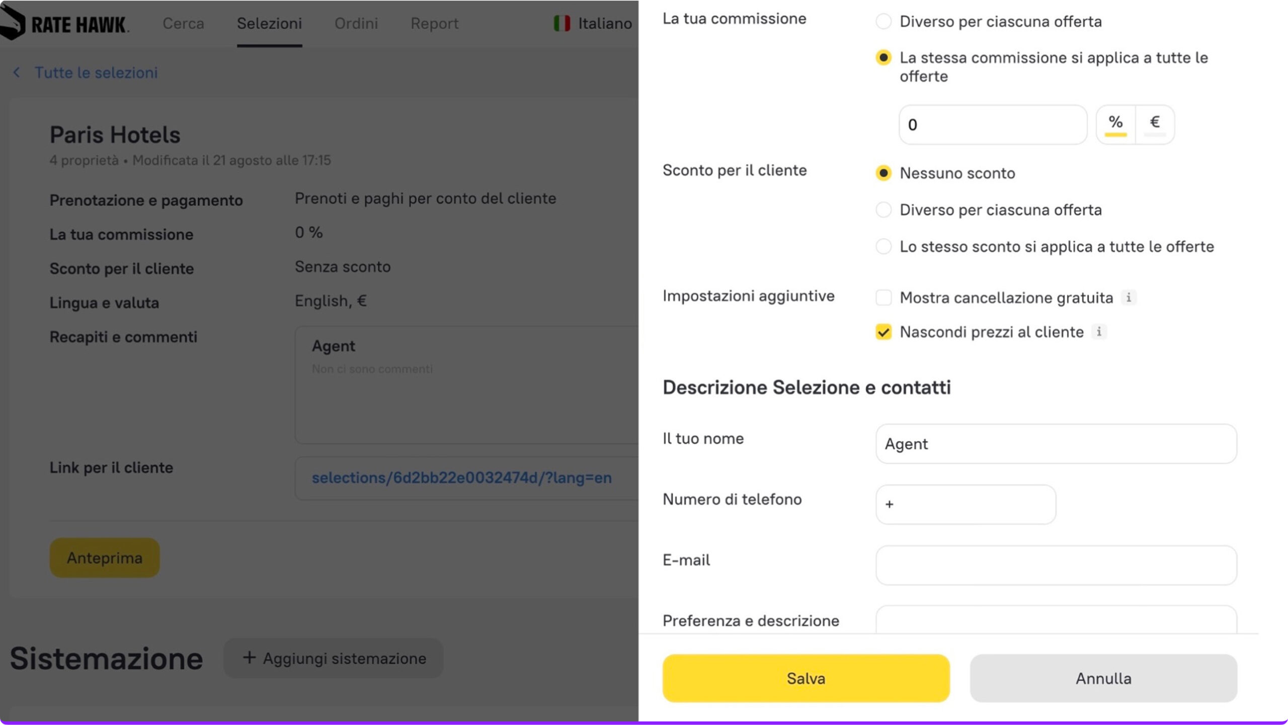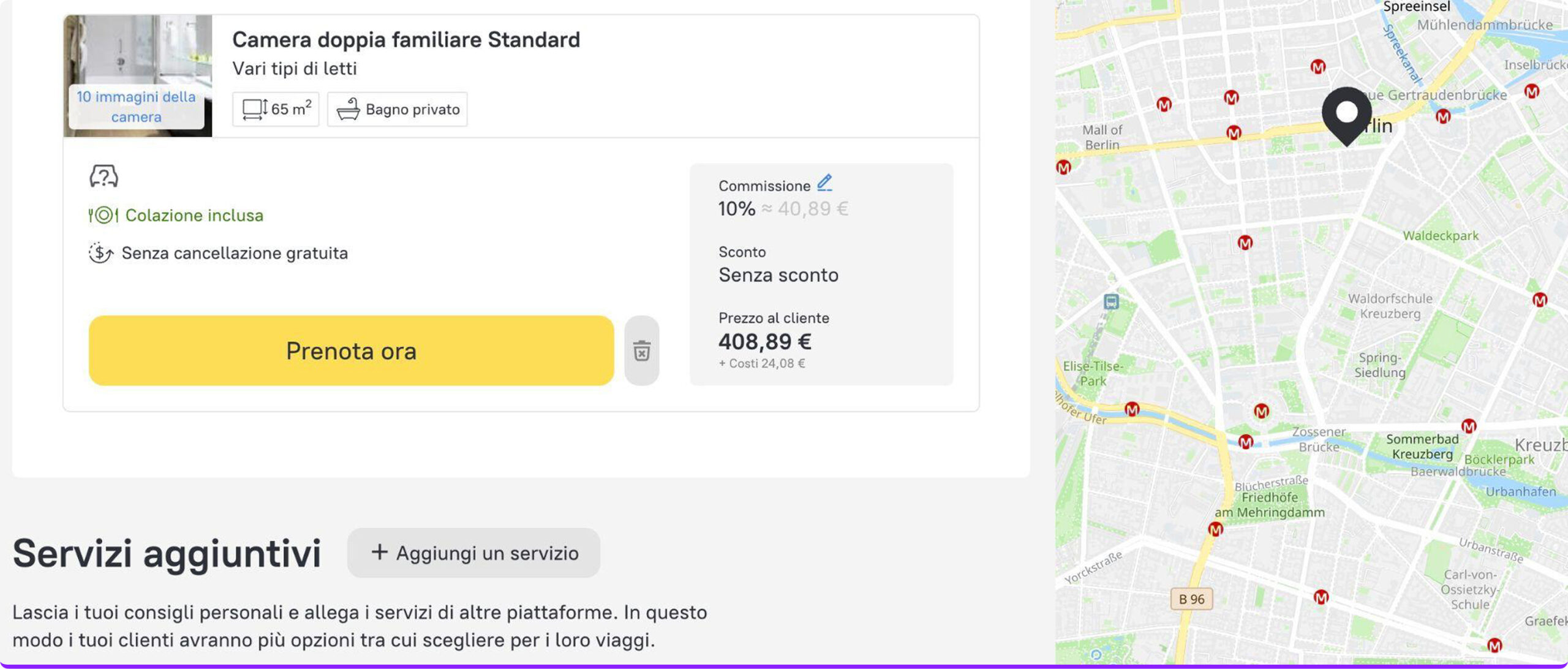 Puoi assegnare una commissione uguale per tutti gli hotel, o impostarne una diversa per ogni proposta in elenco. Questo dato è visibile solo a te e il cliente vedrà solo il prezzo finale.