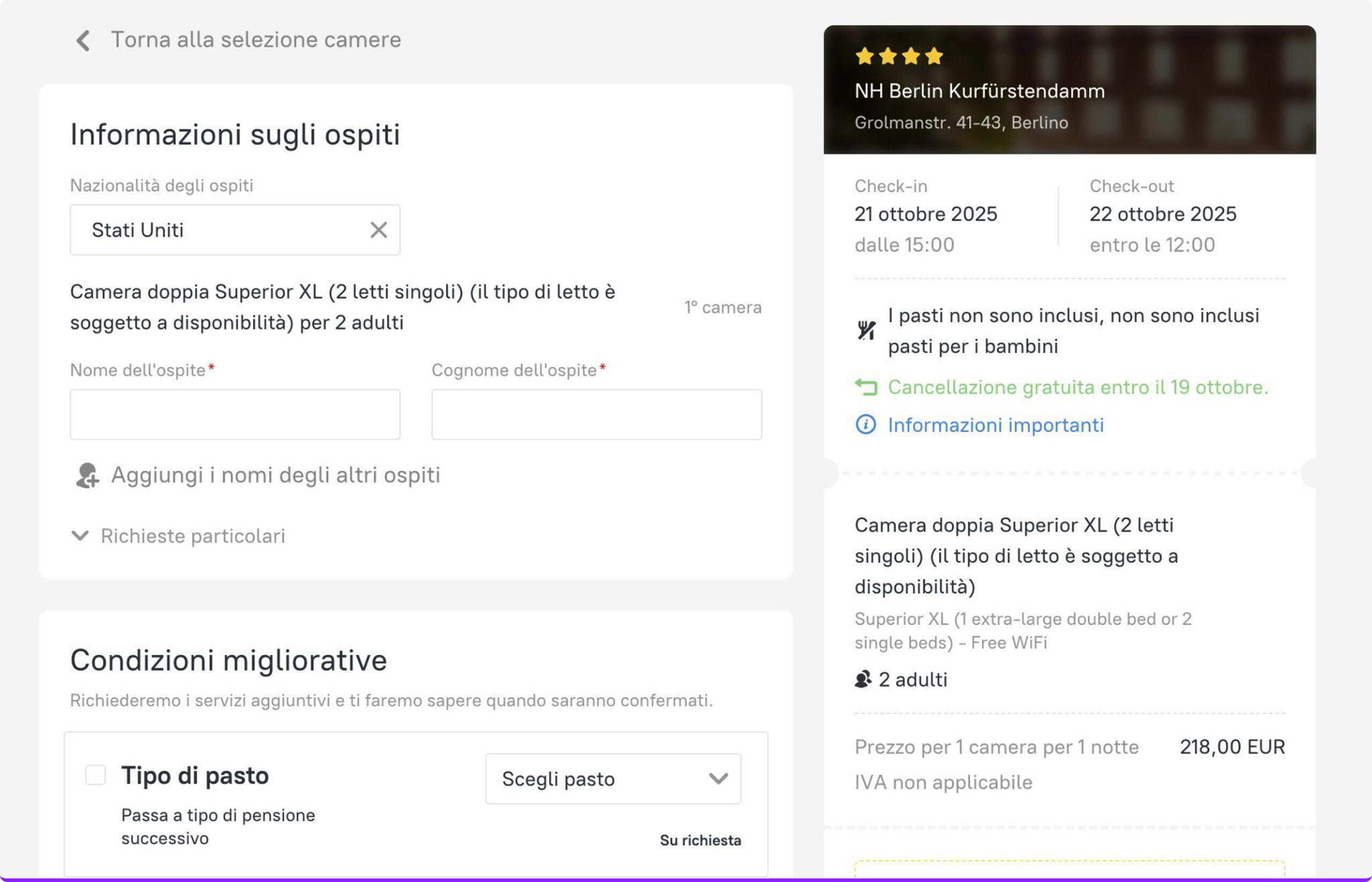Una volta che i clienti hanno scelto la sistemazione e i servizi aggiuntivi, è ora di procedere alla prenotazione! Il modulo di prenotazione di RateHawk è progettato in modo intuitivo, grazie a spiegazioni e consigli accanto ai campi più importanti e a un riquadro informativo con i dettagli della prenotazione.
