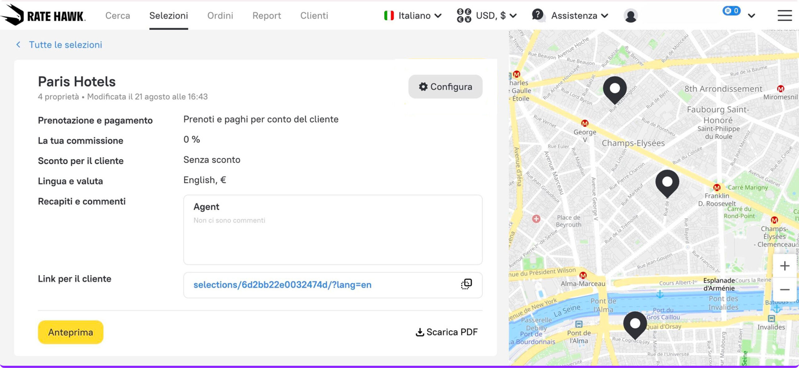 Per prima cosa, crea un elenco personalizzato di hotel da condividere con il cliente sotto forma di link o file PDF. Vai alla scheda “Preventivi” e clicca su “Crea un preventivo”. Scegli hotel nelle varie città dell’itinerario (in questo caso Parigi e Nizza) e combinali in una raccolta ordinata affinché il cliente possa esaminarla facilmente.