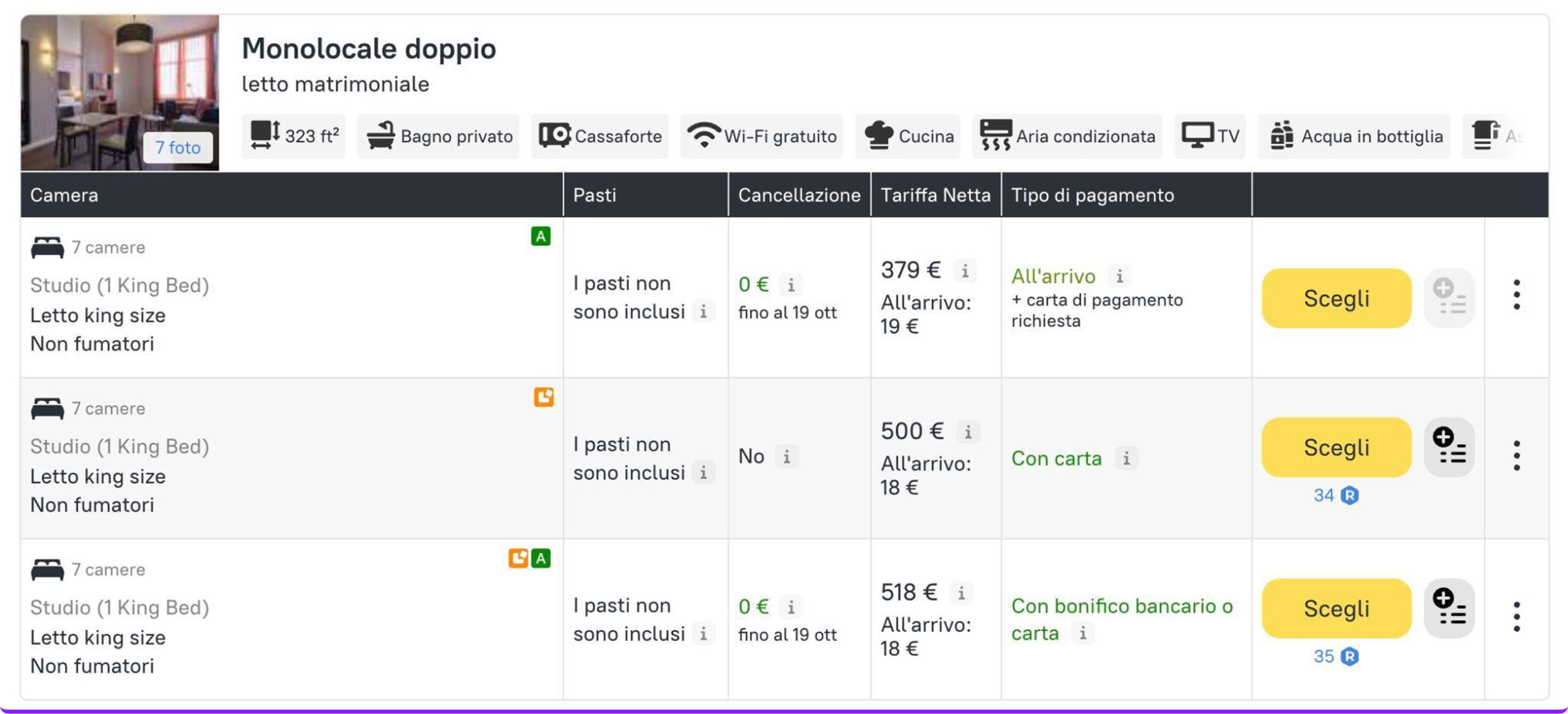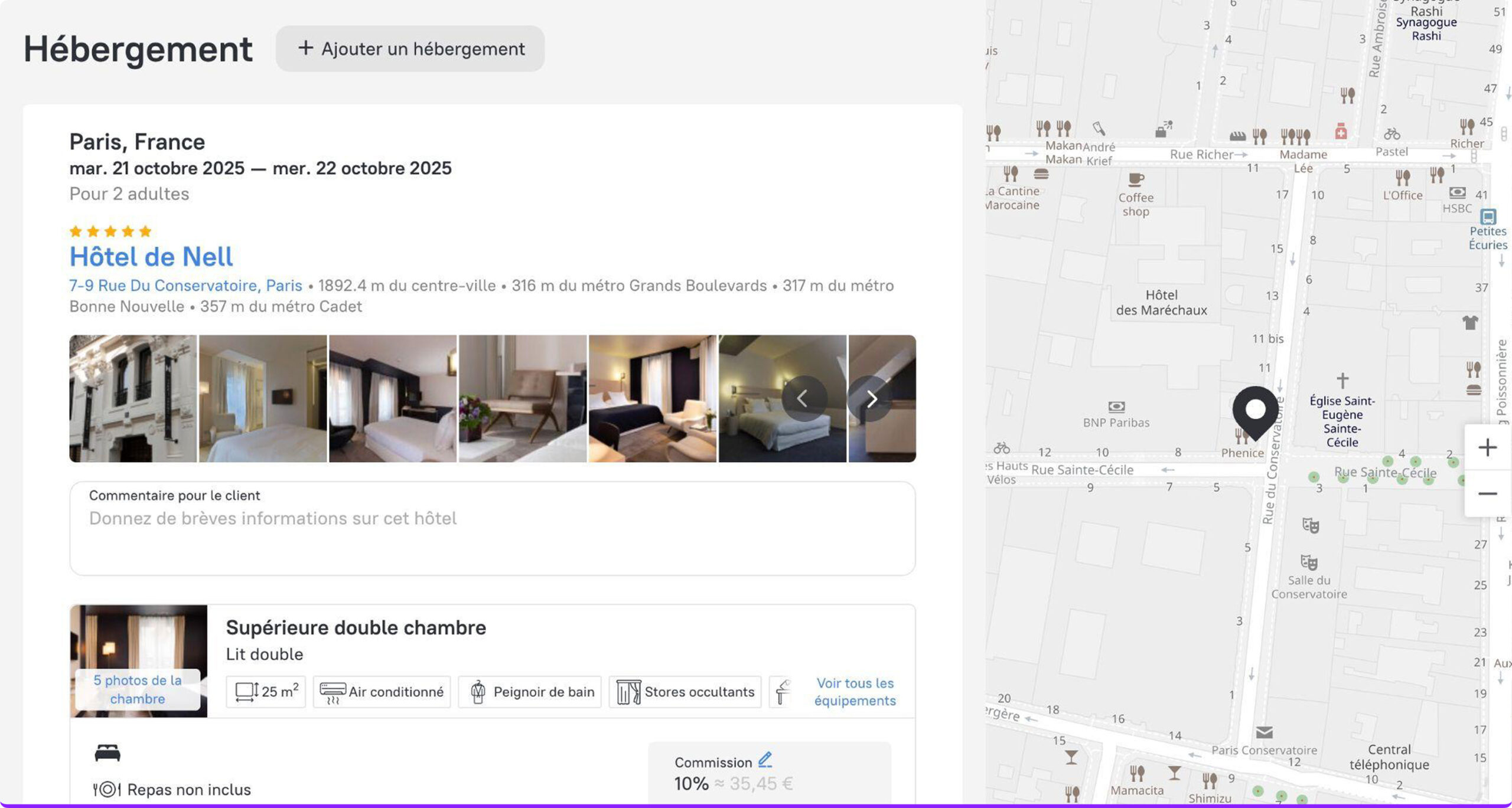 Aggiungi le tariffe cliccando sul segno “+” e selezionando le offerte che desideri includere. Puoi aggiungere gli alloggi sia per Parigi che per Nizza, oltre a più tariffe per lo stesso hotel.