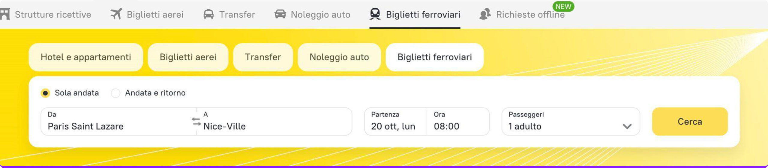 Prenotare un biglietto ferroviario tramite RateHawk è facile e intuitivo. Vai alla scheda “Biglietti ferroviari” sulla piattaforma di RateHawk. Seleziona il tipo di tratta (da Parigi a Nizza), inserisci la destinazione, scegli le date di viaggio e clicca su “Cerca”.