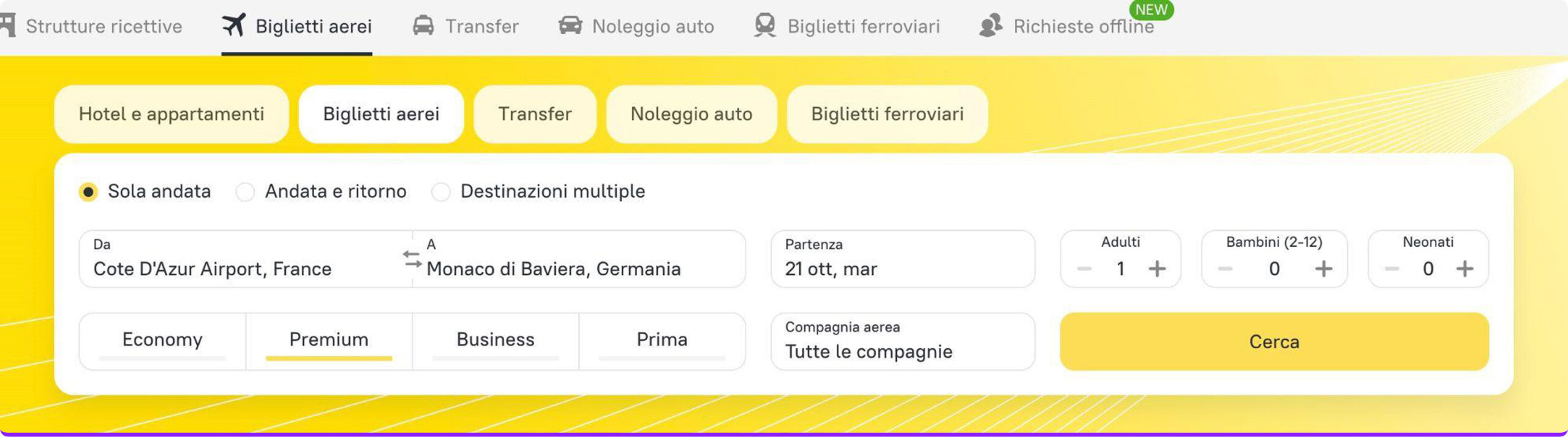 Per prenotare un volo da Nizza, in Francia, a Monaco, in Germania, via alla scheda “Biglietti aerei”, compila il modulo di ricerca e scegli i voli più adatti. Qualora la scheda non fosse disponibile nel tuo account, contatta il tuo Account Manager per richiedere assistenza.