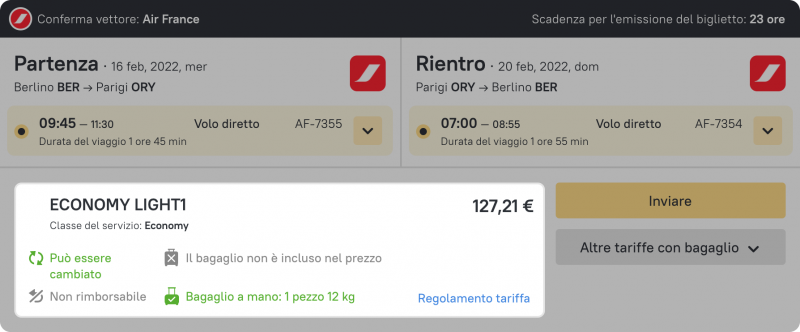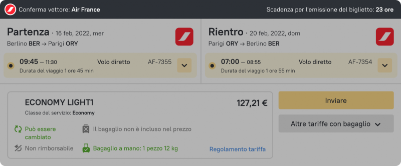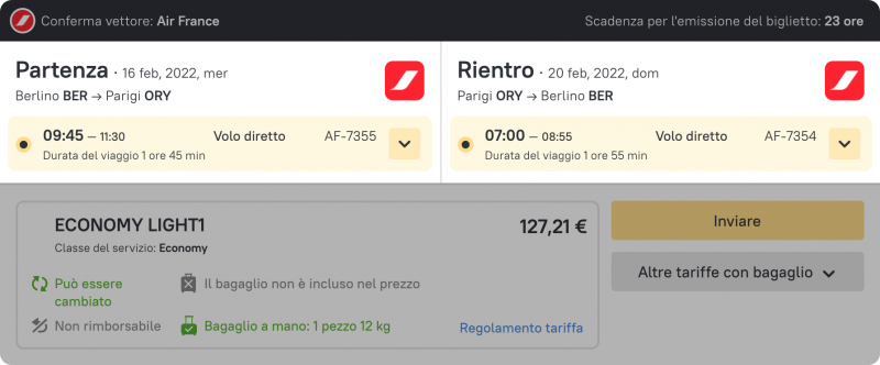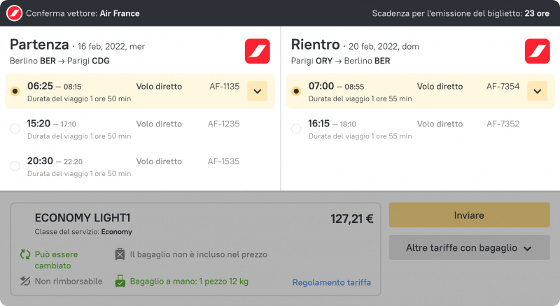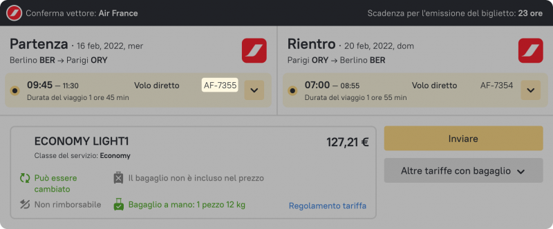 Prima i voli in partenza e in arrivo si trovavano uno sopra l’altro. Per rendere più facile selezionare i voli e confrontare tutti i dettagli, li abbiamo messi in colonna. Grazie a questo, la pagina di ricerca è diventata più compatta: le opzioni per il volo e i dettagli della tariffa sono visibili nella stessa schermata.