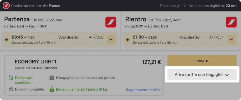 Se per il volo selezionato sono disponibili altre tariffe, potrai vederle con un solo clic. Il pulsante adesso si trova nell’angolo in basso a destra sotto il pulsante seleziona.