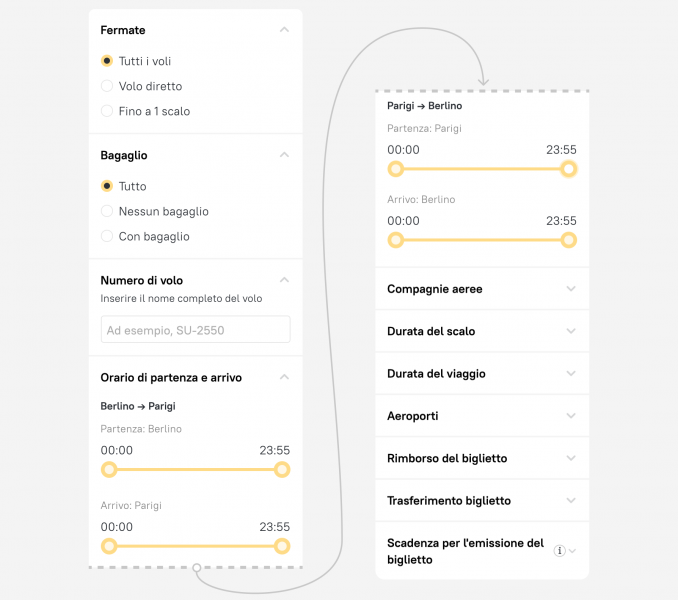 Abbiamo mantenuto tutti i filtri richiesti, ma li abbiamo resi più comprensibili e messi in un ordine più idoneo. Adesso puoi selezionare il volo più velocemente, escludendo i voli con scalo, selezionando le opzioni per bagaglio e altro ancora.