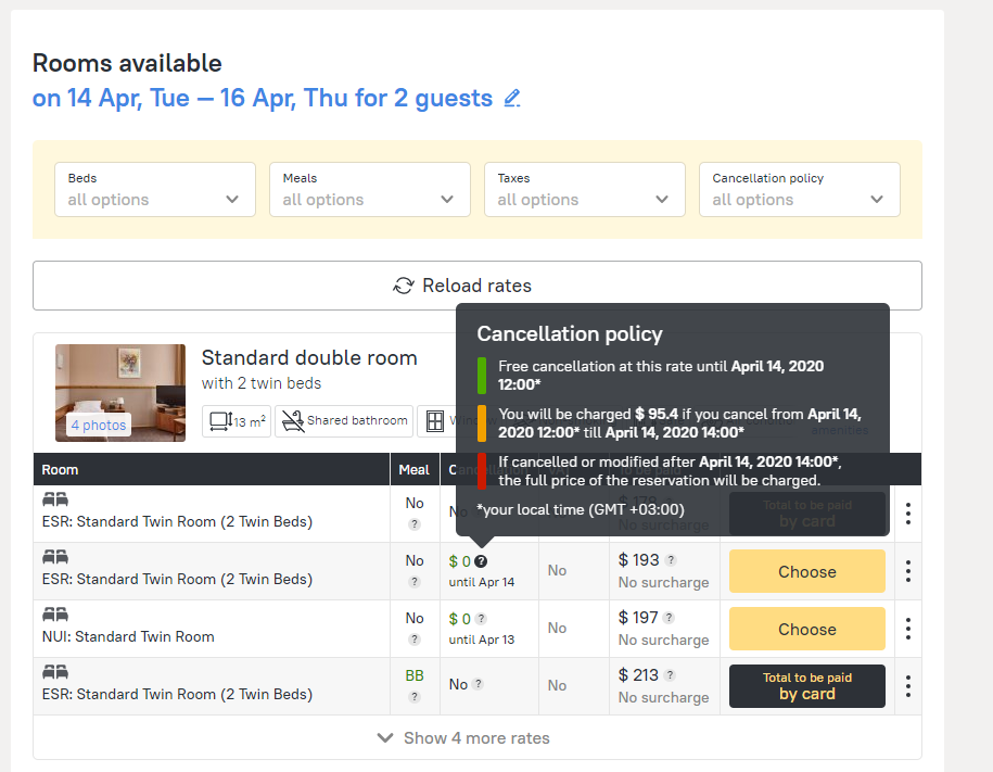 For example, you booked a hotel in Moscow from 14 to 16 April 2020. The rate’s cancelation terms indicate that in the event of cancelation from 14 April 2020 12:00 to 14 April 2020 14:00, you need to pay a fine totaling 95.4$. In the event of cancelation after 14 April 2020, 14:00 the fine will total 100% of the booking cost.