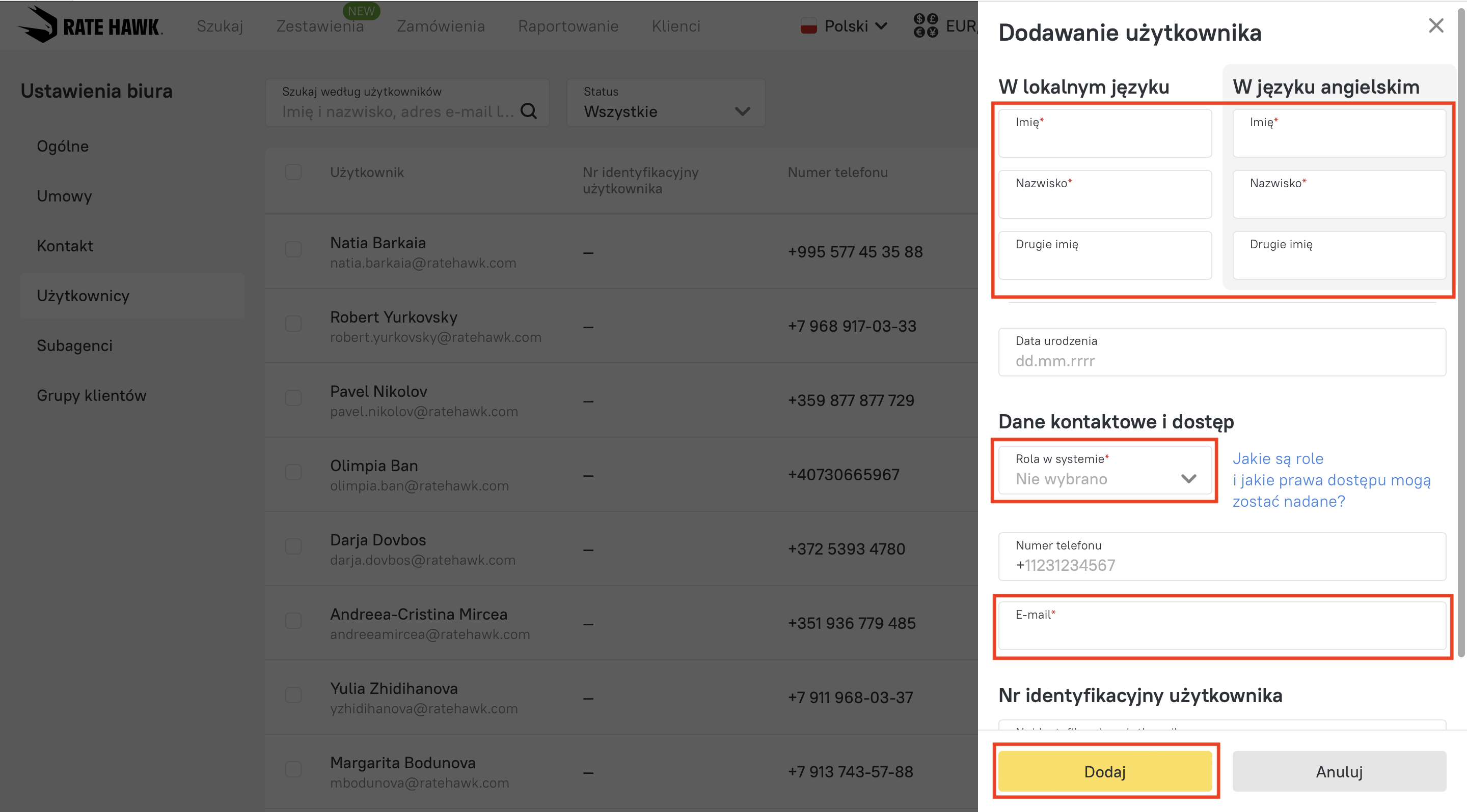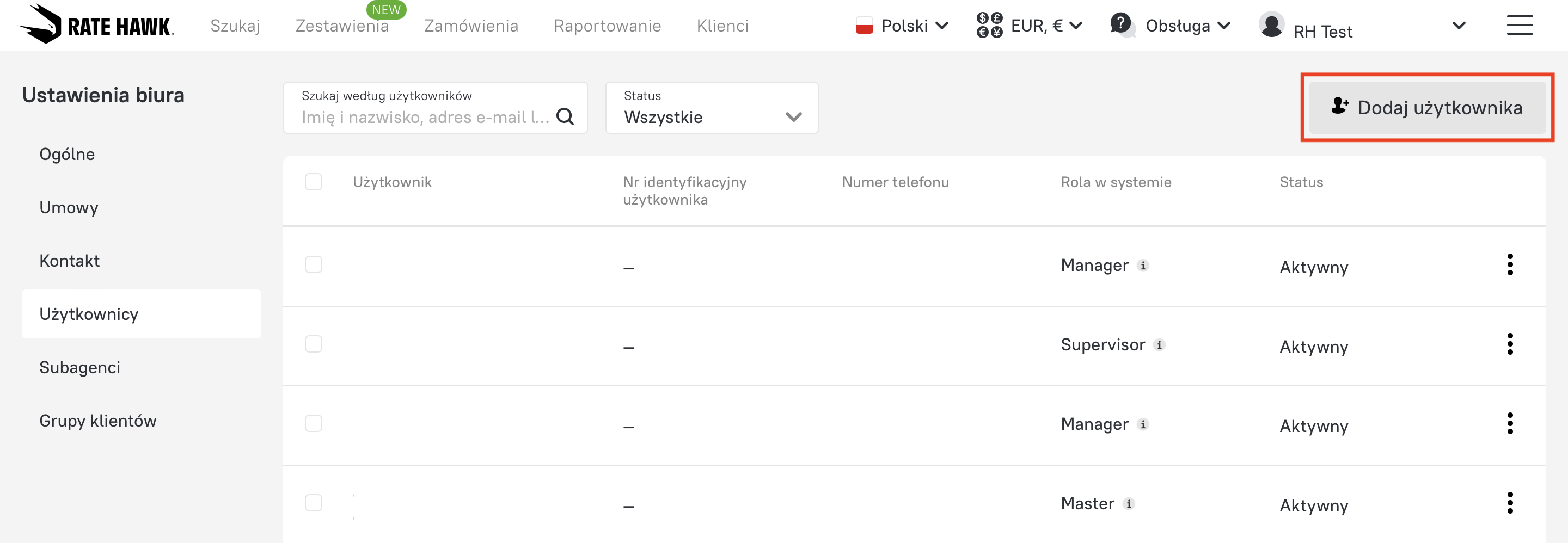 Po zarejestrowaniu każdego użytkownika z własnym profilem w serwisie RateHawk, użytkownik z rolą Master może przypisywać role i zarządzać nimi oraz dodawać nowych użytkowników do konta. Na tym stanowisku może również zapewnić, że użytkownicy na stanowiskach Finance lub Manager uzyskają dostęp tylko do obszarów niezbędnych dla ich ról.