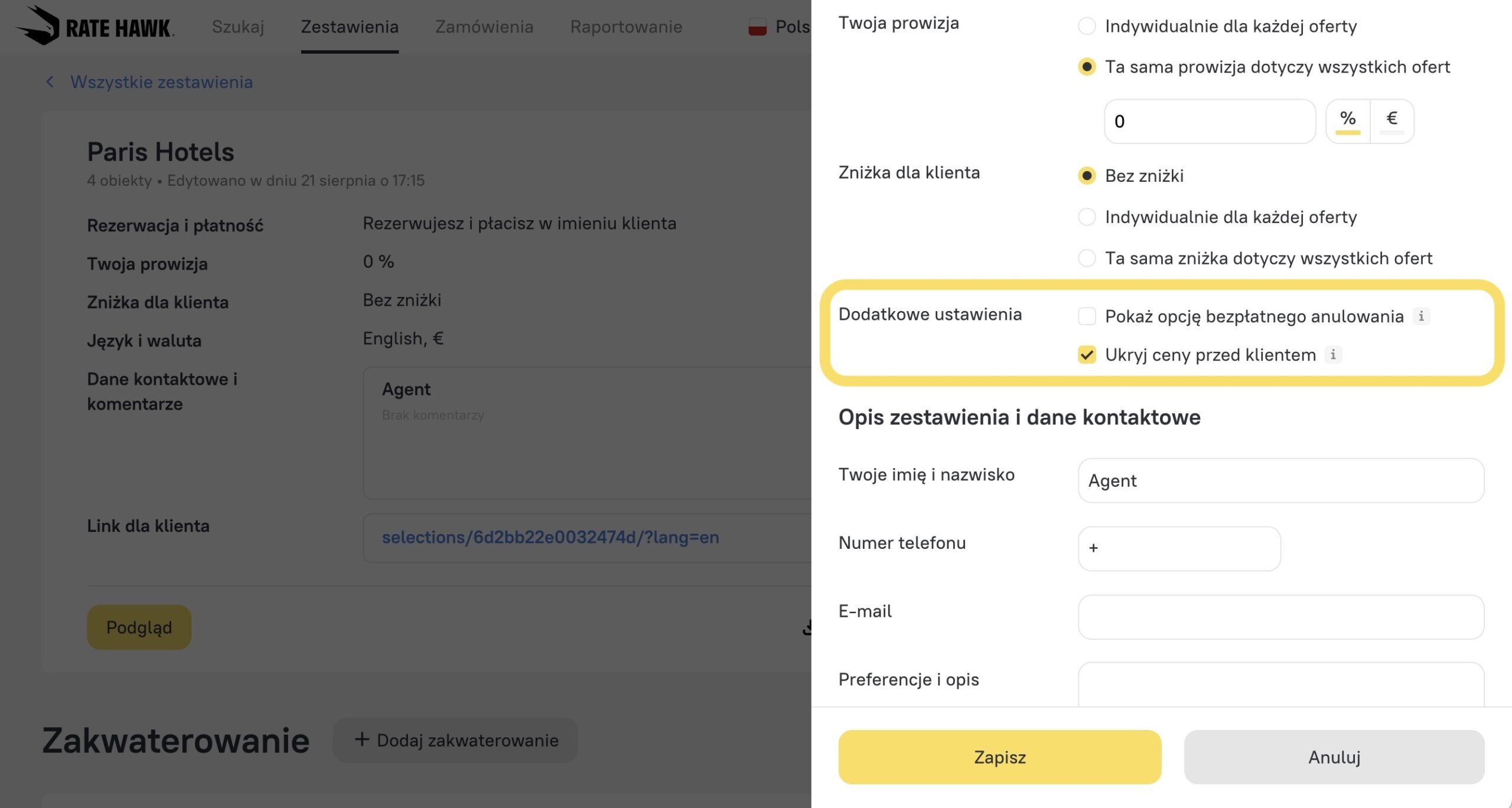2. Po kliknięciu przycisku „Ustaw” po prawej stronie strony otworzy się wygodne okno podręczne. Tutaj możesz szybciej i łatwiej personalizować wybrane opcje. W ustawieniach dostępne jest teraz pole wyboru „Ukryj ceny przed klientem” – często zgłaszana funkcja, która pozwala udostępniać piękne kolekcje bez wyświetlania cen.