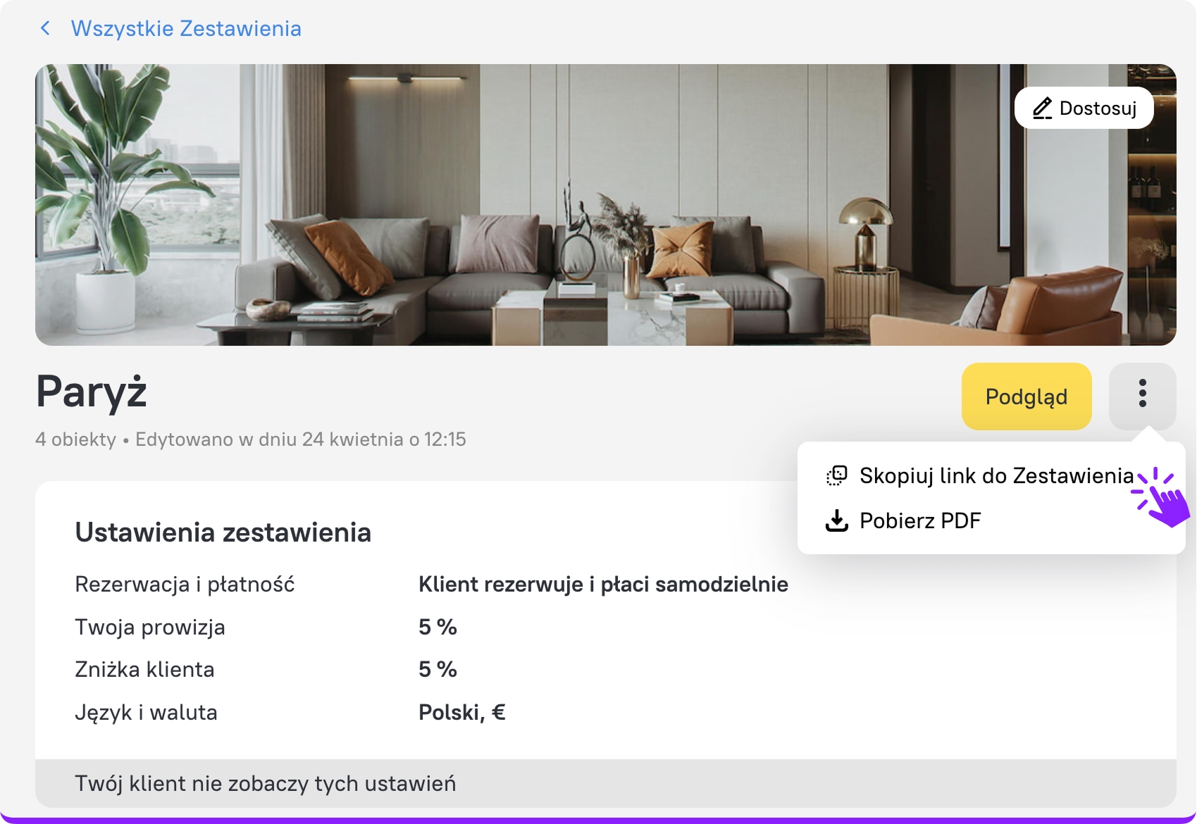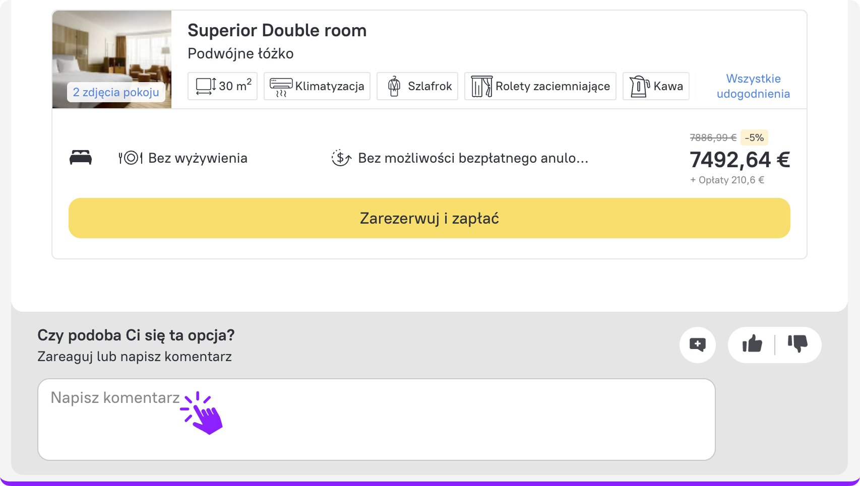 Koniec ze zgadywaniem, co podoba się klientowi – teraz może reagować i zostawiać komentarze bezpośrednio w Zestawieniach. Dzięki temu lepiej zrozumiesz wybory klientów, szybciej dopracujesz ofertę i sprawniej zamienisz Zestawienia w potwierdzone rezerwacje.
