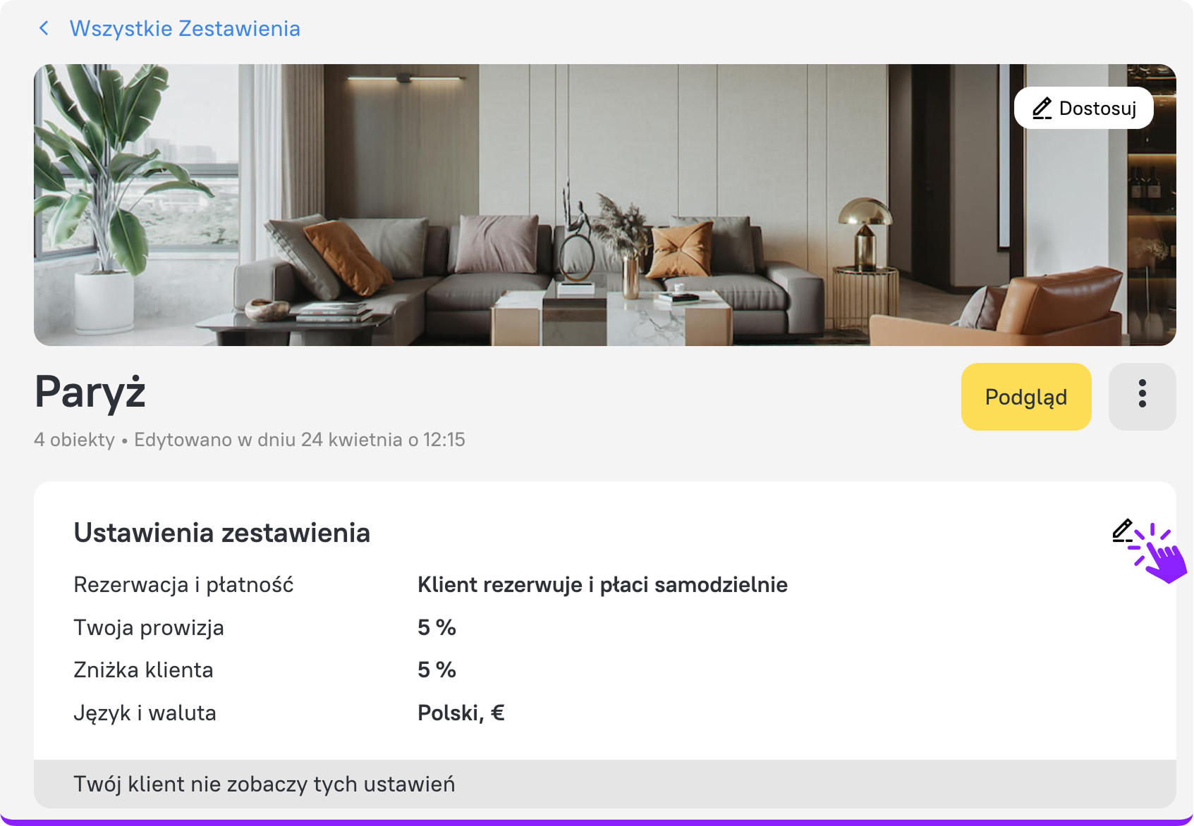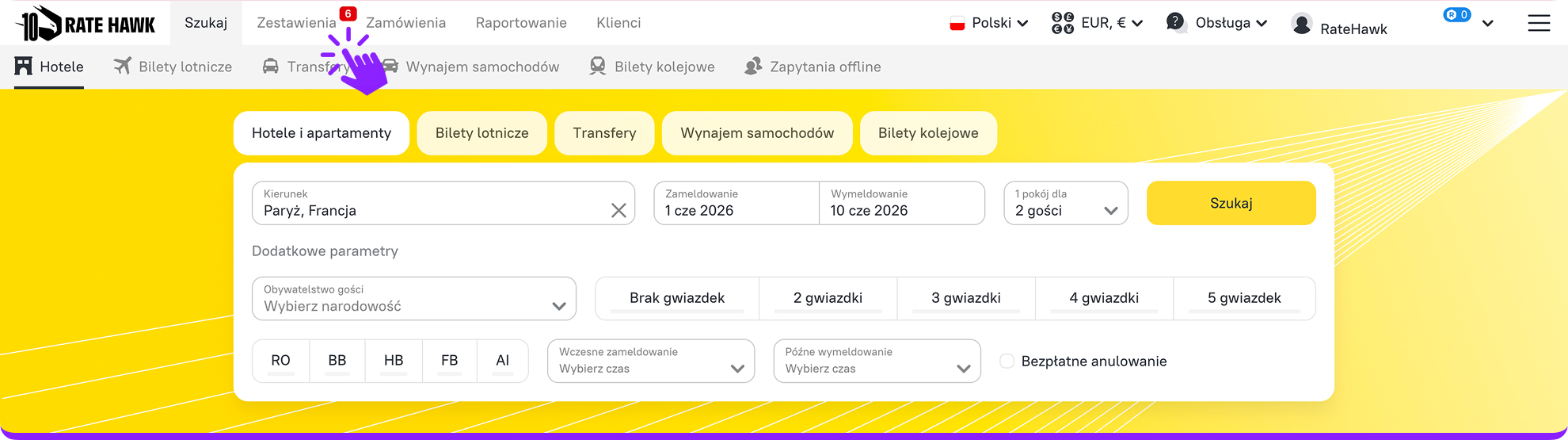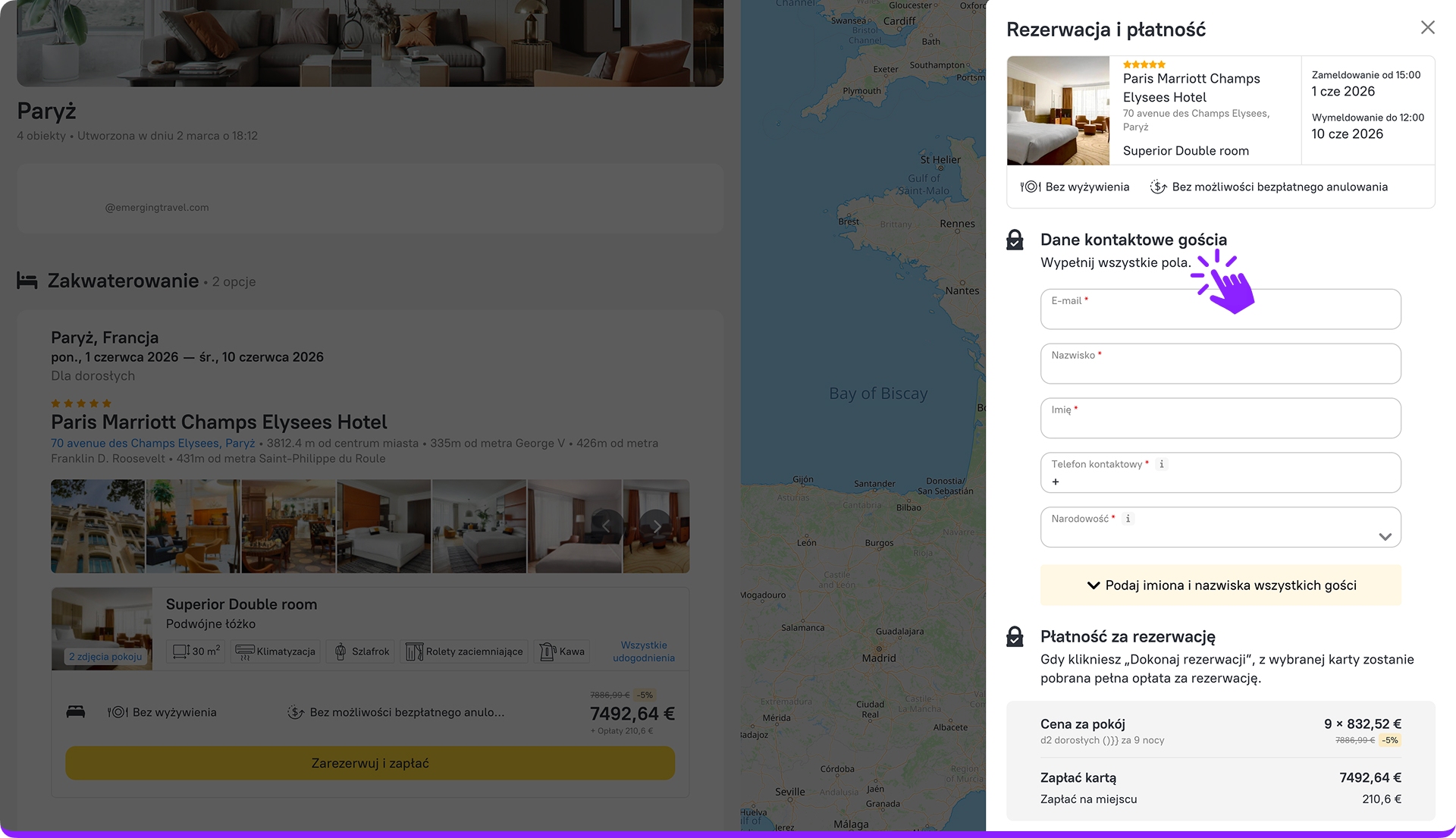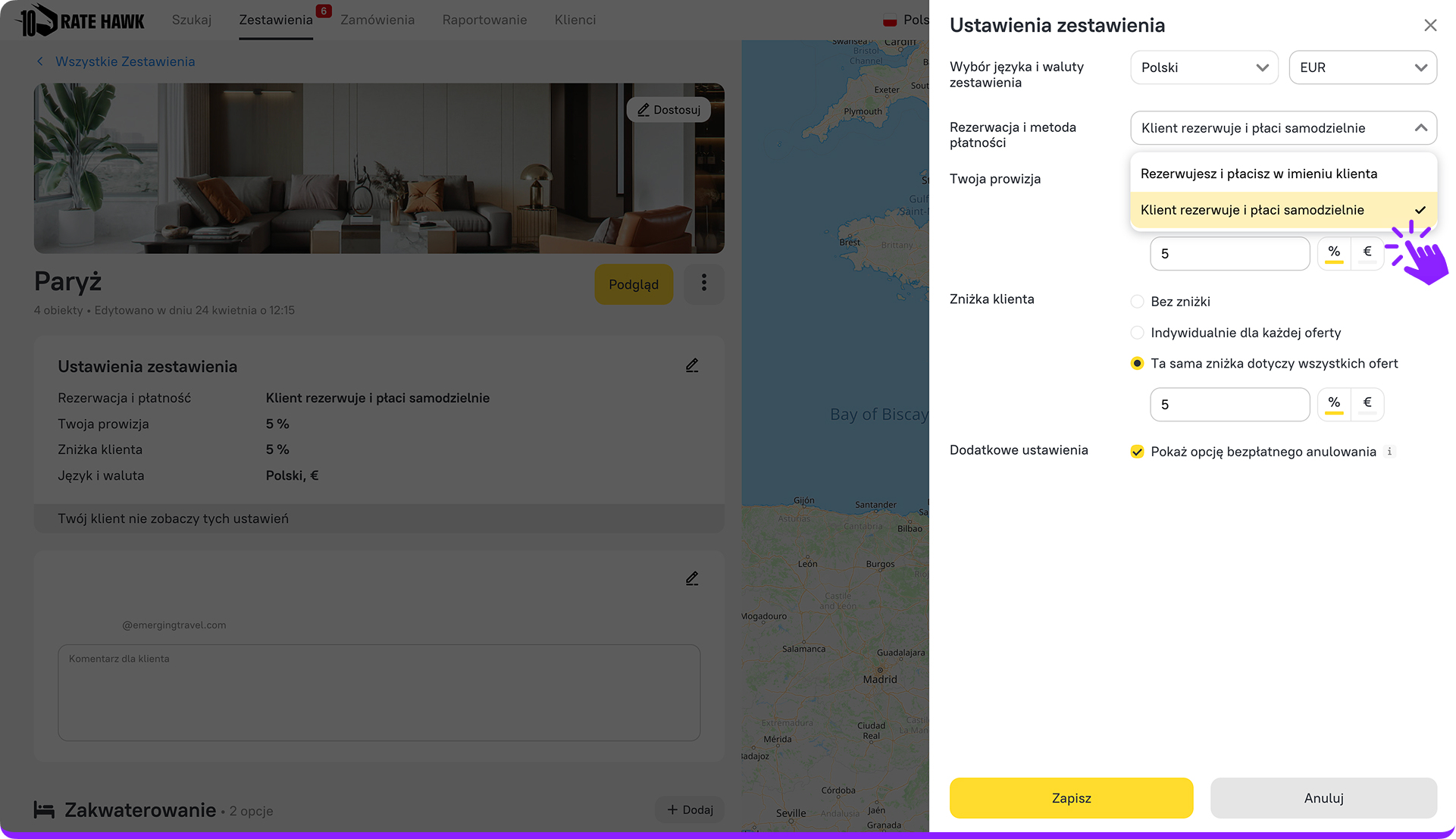 Twoi klienci mogą teraz opłacać hotele bezpośrednio z poziomu Zestawień, co ogranicza po Twojej stronie potrzebę ręcznego koordynowania płatności. Mniej wiadomości tam i z powrotem oznacza szybsze płatności i oszczędność czasu na finalnym etapie rezerwacji.