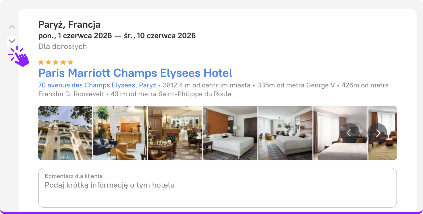 Dzięki nowej funkcji ręcznego sortowania w Zestawieniach zyskujesz jeszcze większą kontrolę nad tym, jak prezentowane są oferty hoteli i transferów. Nadając priorytet najbardziej trafnym opcjom, możesz skuteczniej ukierunkować decyzje swoich klientów.
