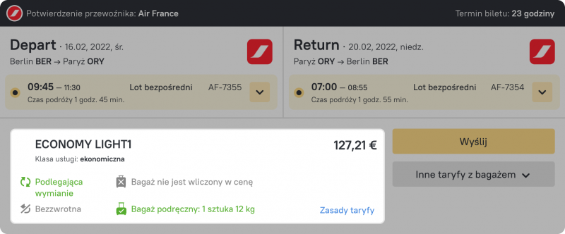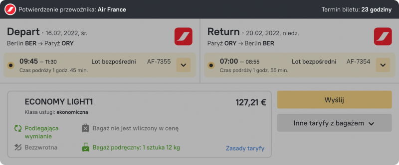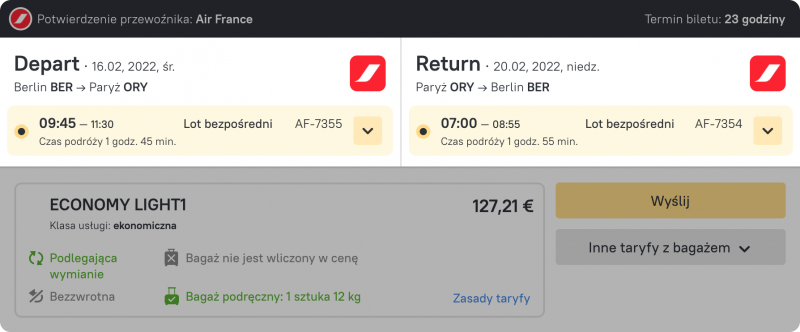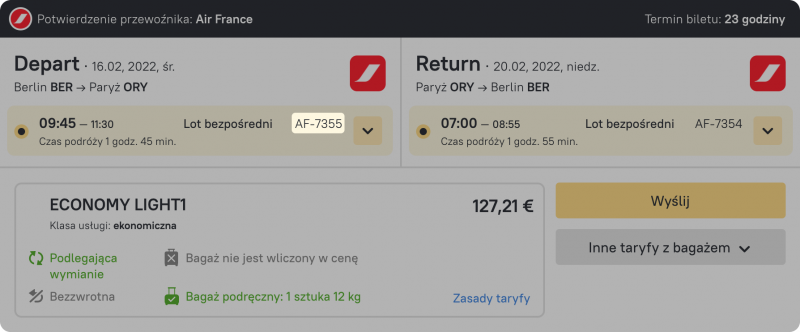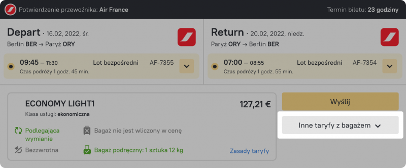Jeśli inne taryfy są dostępne dla danego lotu, możesz je łatwo zobaczyć i przełączyć jednym kliknięciem. Odpowiedni przycisk jest umieszczony w prawym dolnym rogu pod przyciskiem wyboru.