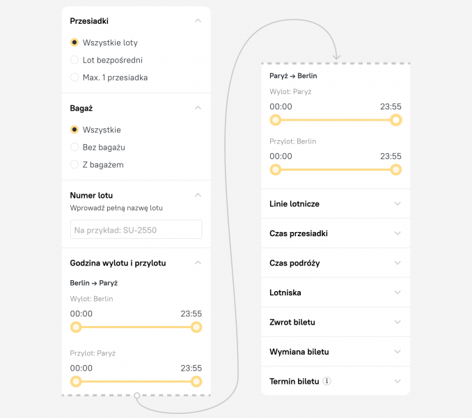 Zachowaliśmy wszystkie potrzebne filtry, ale zmodyfikowaliśmy je tak, by były bardziej zrozumiałe i umieściliśmy je w wygodnej kolejności. Teraz możesz jeszcze szybciej zaznaczyć dogodną porę lotu, wyeliminować loty z przesiadkami, zaznaczyć opcję z bagażem I wiele więcej.