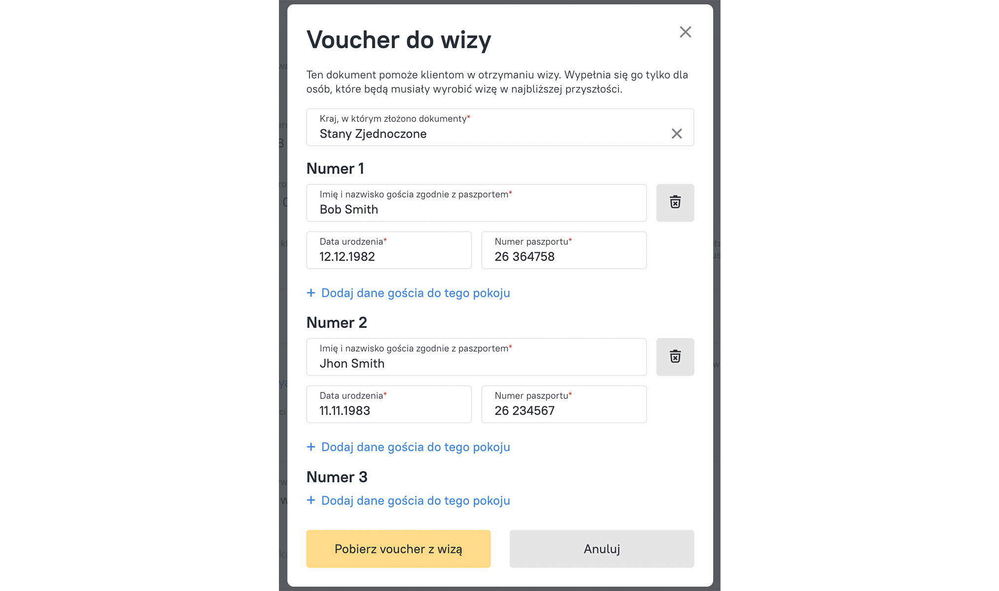 - Uzupełnij dane paszportowe gościa i kliknij przycisk Pobierz voucher do wizy. Jeśli rezerwacja dotyczy dwóch lub więcej osób, kliknij przycisk Dodaj dane gościa do tego pokoju. Jeśli rezerwacja dotyczy więcej niż jednego pokoju, możesz wpisać dane wszystkich gości w tym samym oknie.