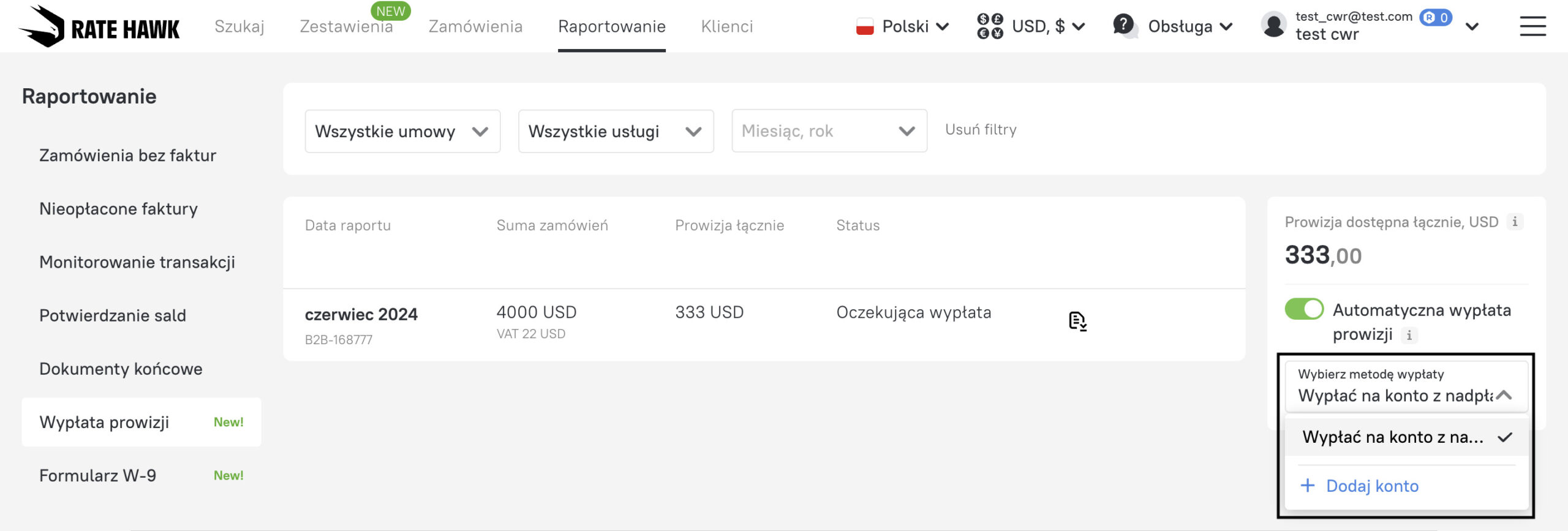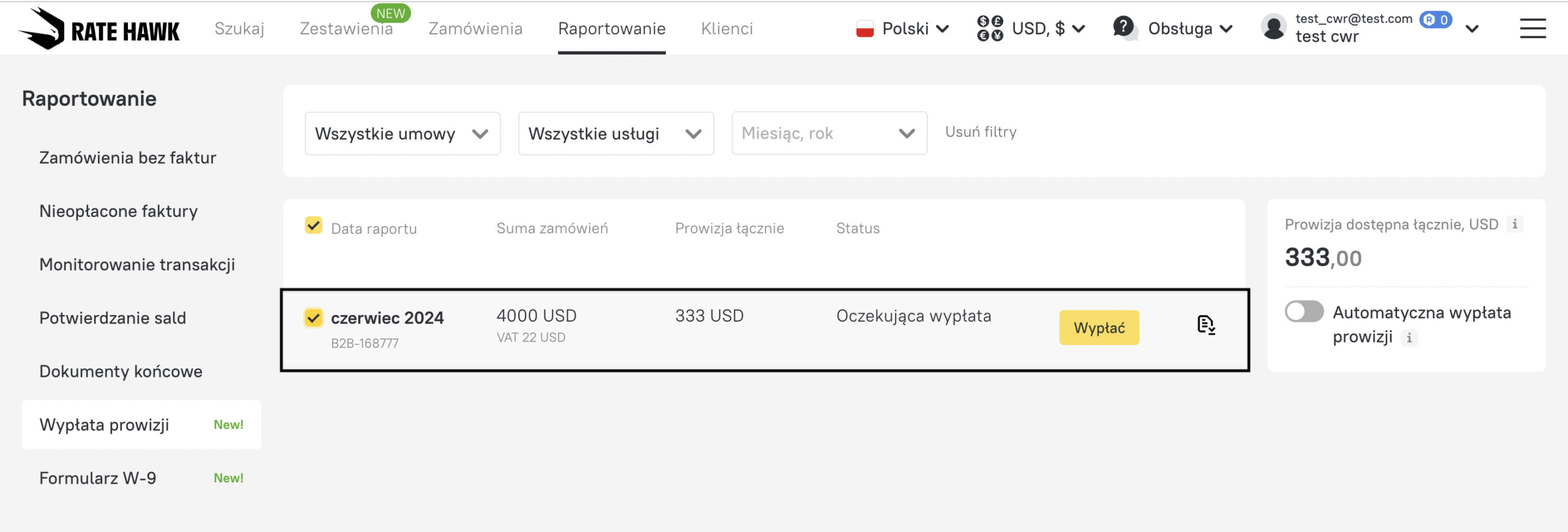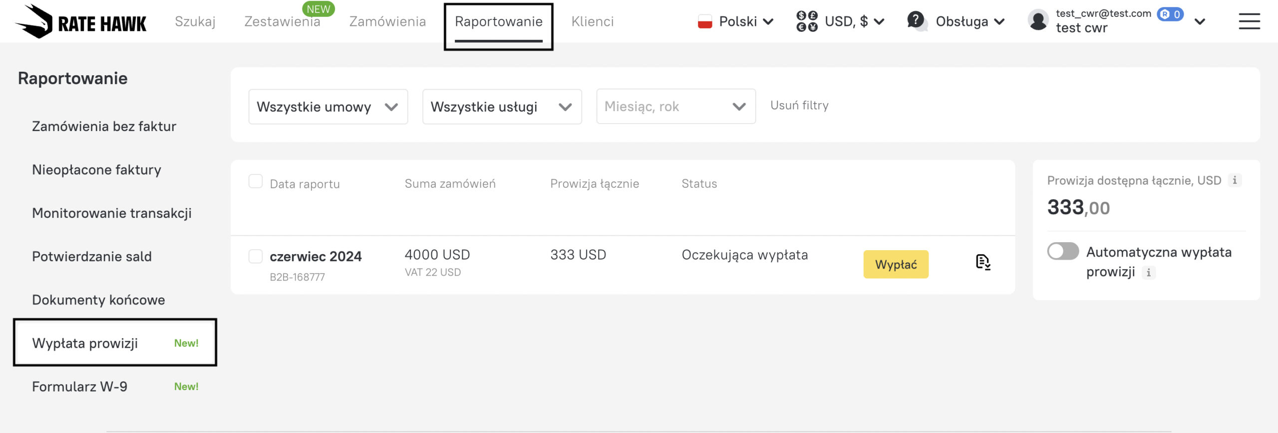 1. Przejdź do zakładki „Raportowanie” i wybierz „Wypłata prowizji”.