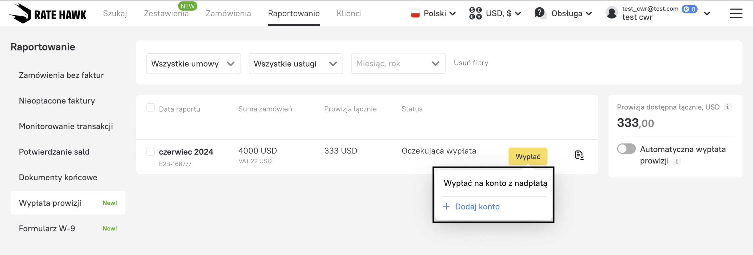 1. Przejdź do „Wypłaty prowizji” w zakładce „Raportowanie”.