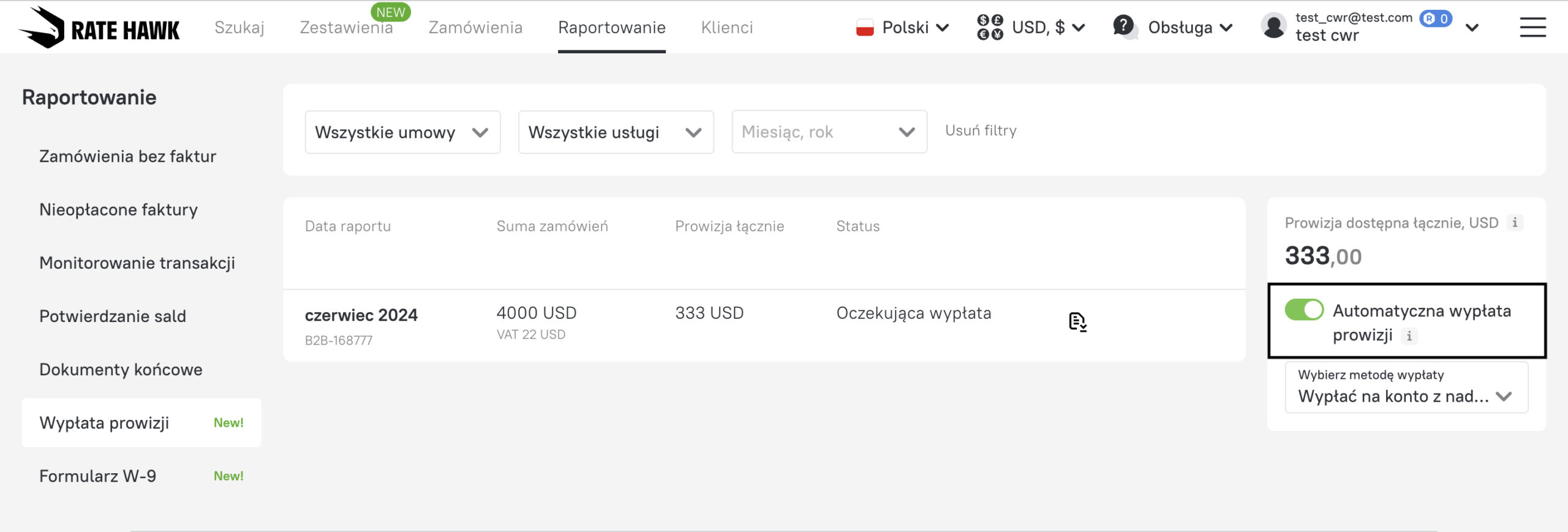 2. Aktywuj przycisk „Automatyczna wypłata prowizji”.