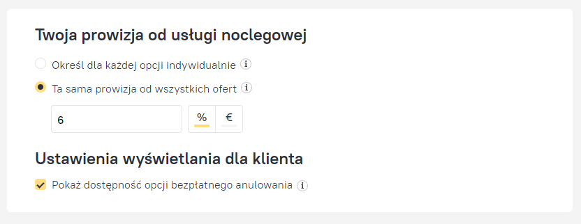 - Ustaw wysokość prowizji i wybierz ustawienia widoczności dla swojego klienta. Tutaj możesz ustawić jedną wysokość prowizji dla wszystkich taryf lub ustawić je dla każdego zestawienia indywidualnie.
