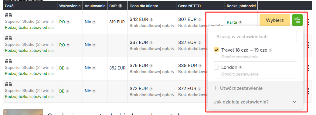 Możesz również utworzyć nowe zestawienie na stronie hotelu podczas wybierania taryfy. Nie zapomnij jednak wrócić do sekcji Zestawienia, aby wprowadzić prowizję i opis dla klienta.