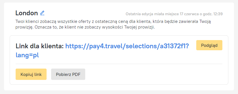 Możesz wysłać klientowi link do dowolnego utworzonego przez siebie zestawienia lub pobrać plik pdf. W obu przypadkach klient zobaczy tylko całkowite ceny razem z prowizją. Co więcej, możesz ustawić inną prowizję dla każdej taryfy!