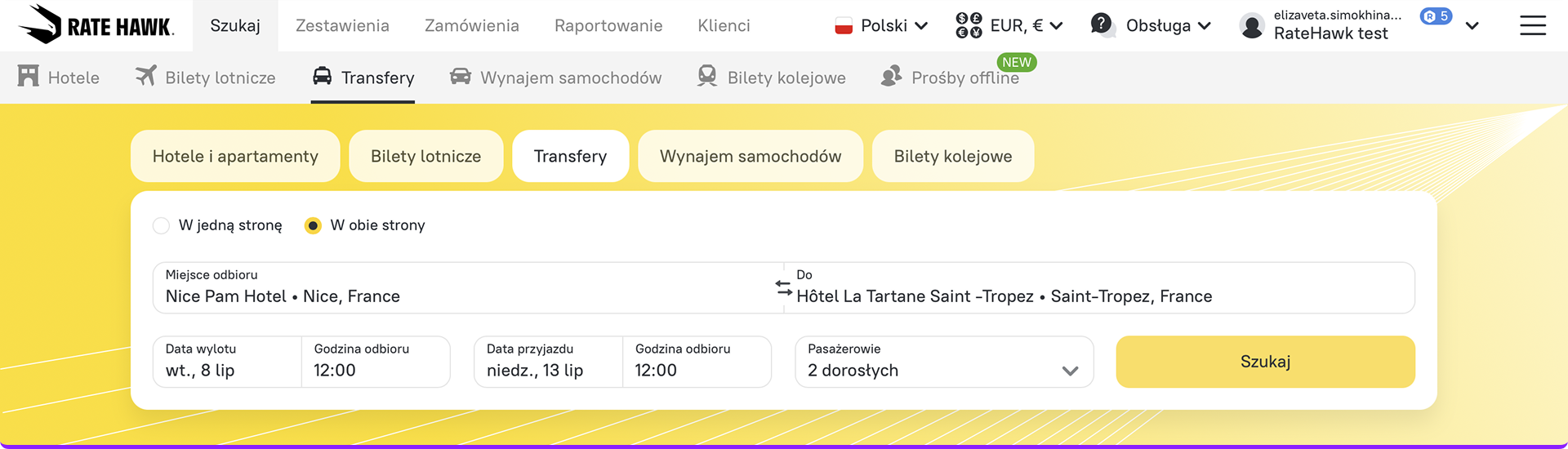 - W formularzu wyszukiwania transferów pojawi się nowy przycisk „W obie strony”, umożliwiający użytkownikom wprowadzenie daty i godziny wyjazdu oraz powrotu.