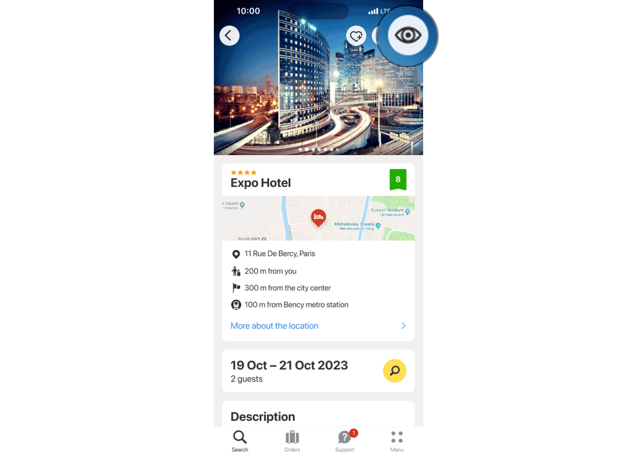 - Open the “Orders” section to check the arrival time and the name of the hotel;