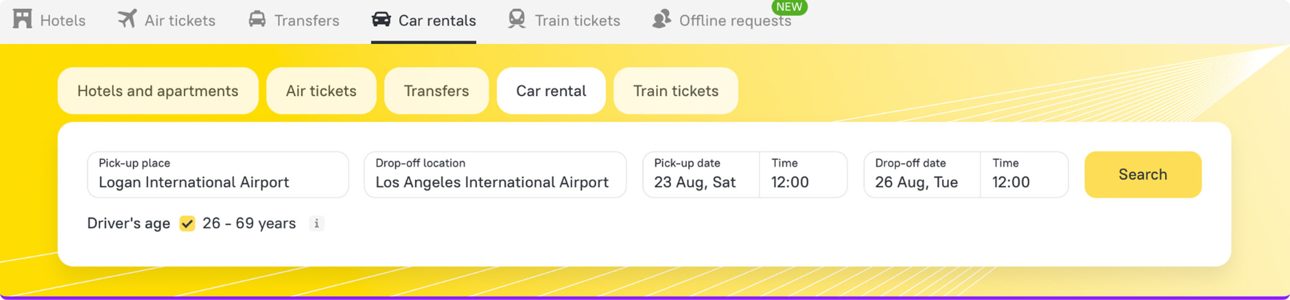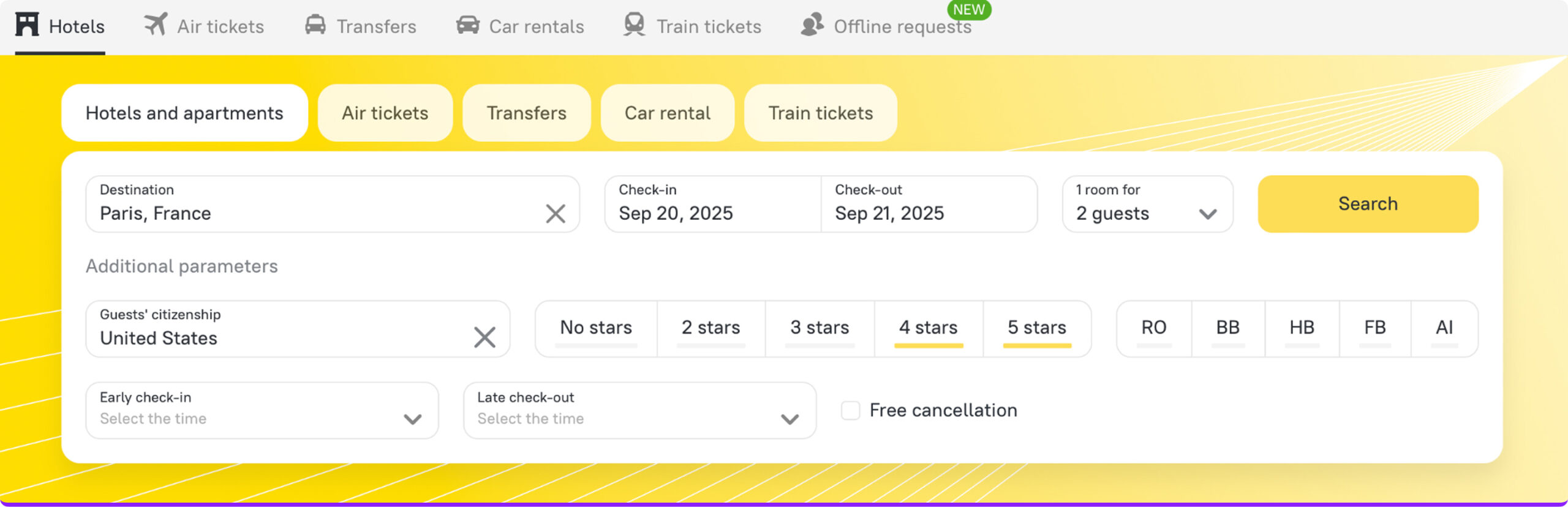 With RateHawk, you can offer your clients complete solutions that combine multiple travel services in a single proposal — from hotels and transfers to flights, trains, and car rentals. This not only adds value to your client’s journey but also creates opportunities to increase sales for each trip.