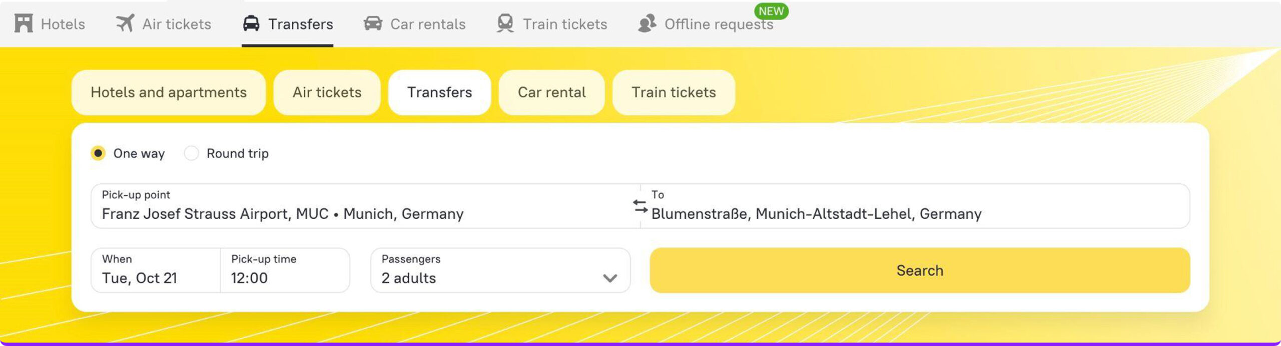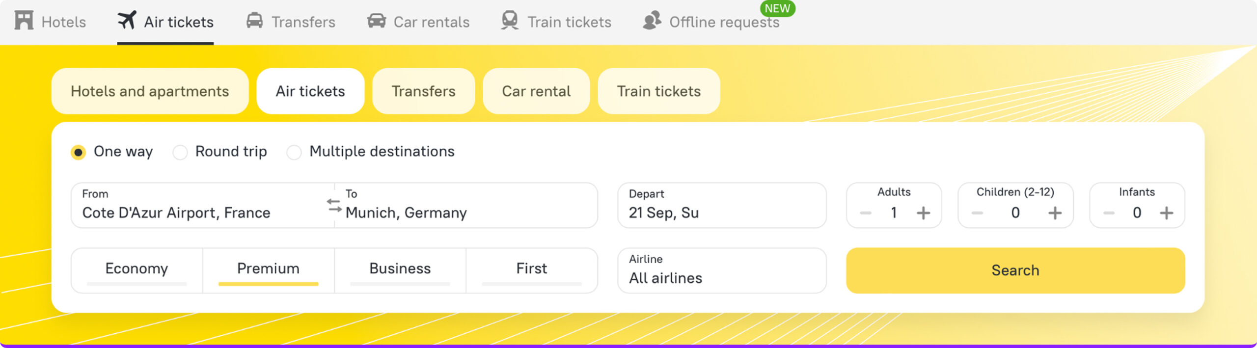 To book a flight from Nice, France, to Munich, Germany, go to the “Air tickets” tab — fill out the search form, and choose the most suitable flights. If this tab is not available in your account, contact your Account Manager for assistance.