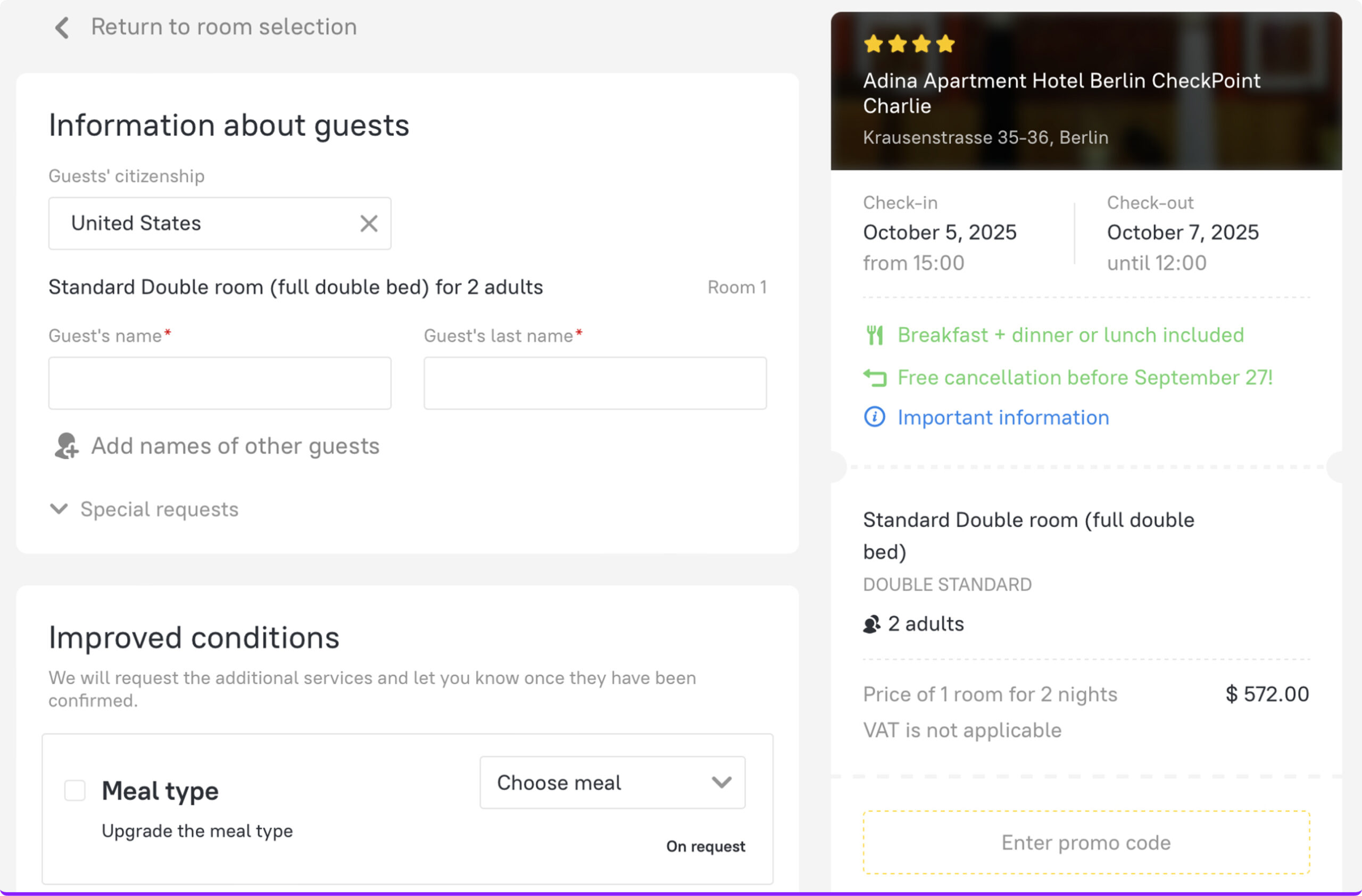Once clients have chosen their accommodation and additional services, it’s time to proceed with the booking! The RateHawk booking form is designed to be straightforward, with explanations and tips next to important fields, and an information block with booking details.